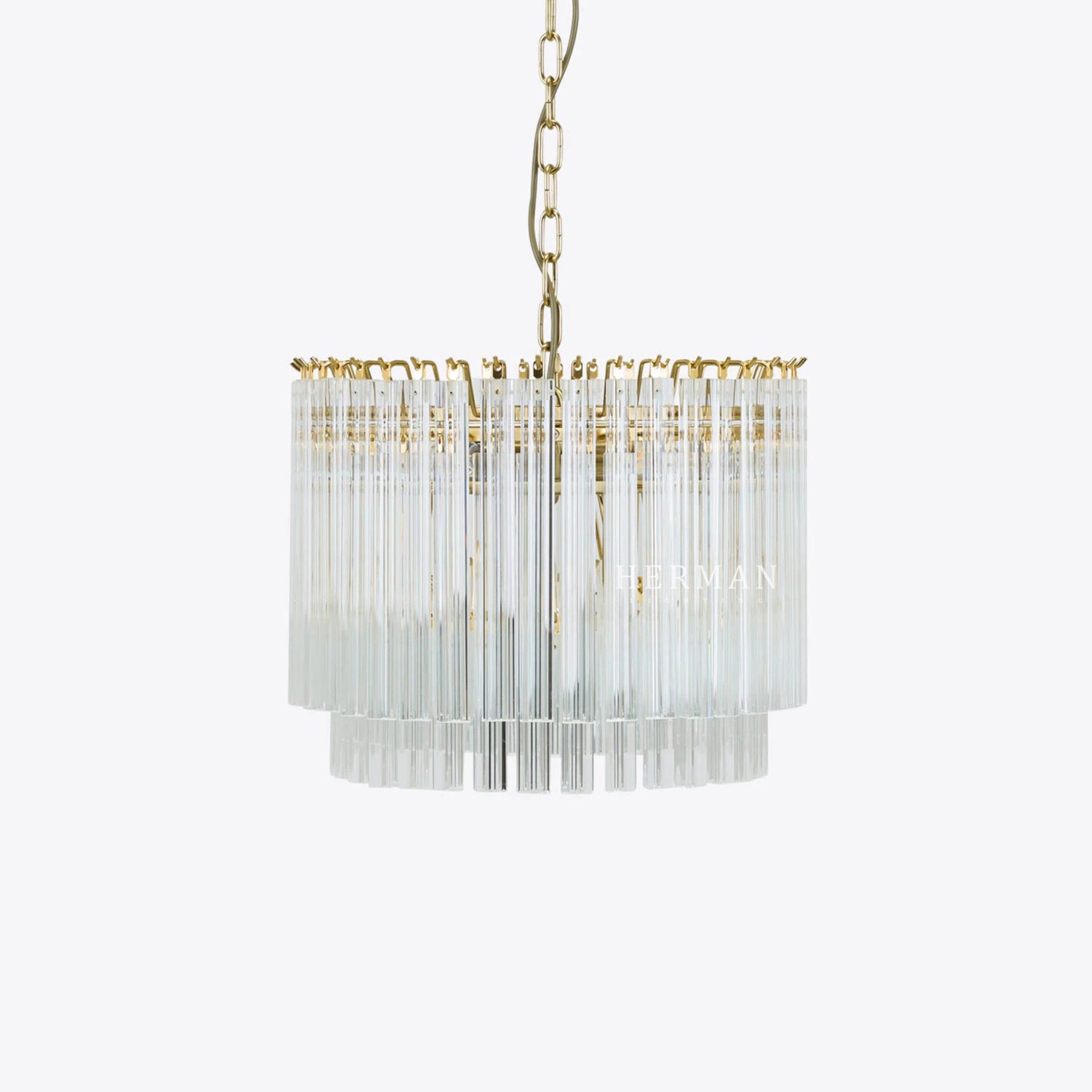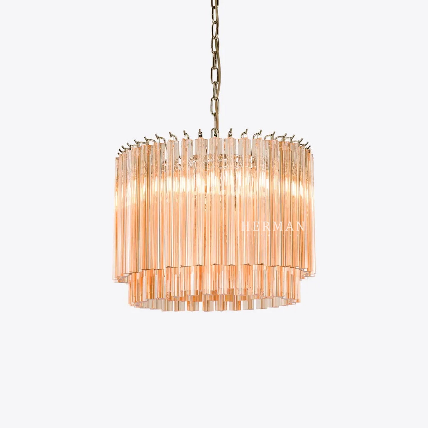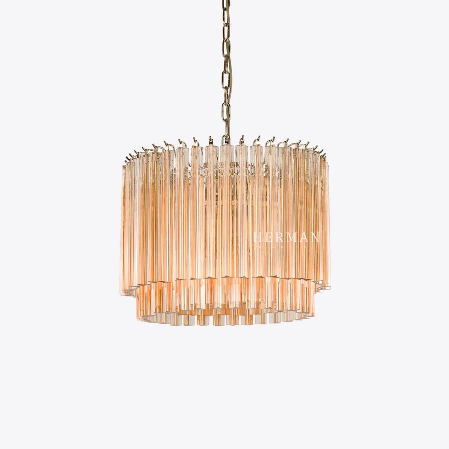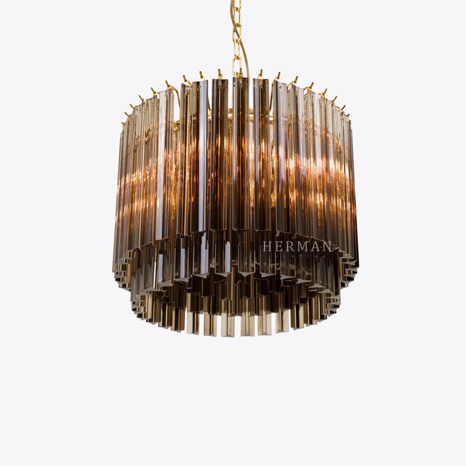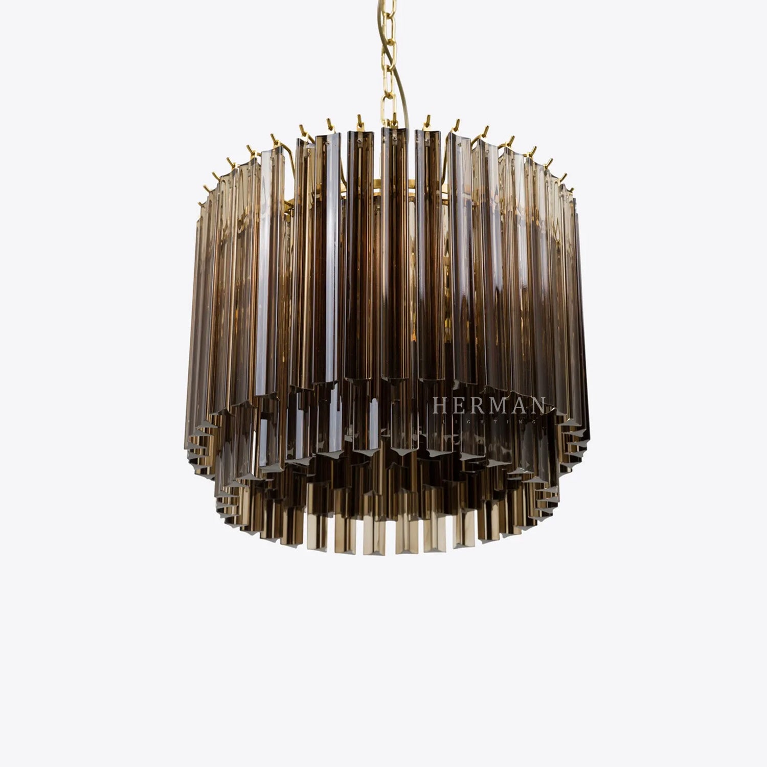 The Amaro chandeliers feature layers of mid-century inspired tri-style glass prisms, making them the ideal centerpiece for smaller spaces like living rooms, dining areas, or lobbies.