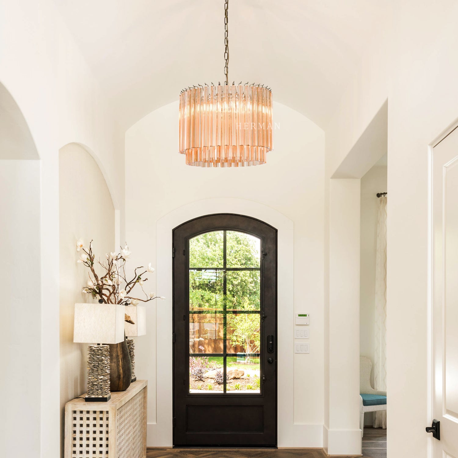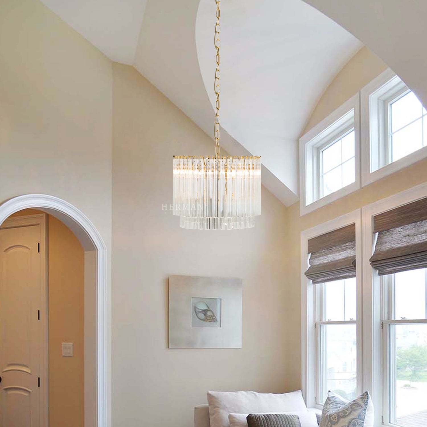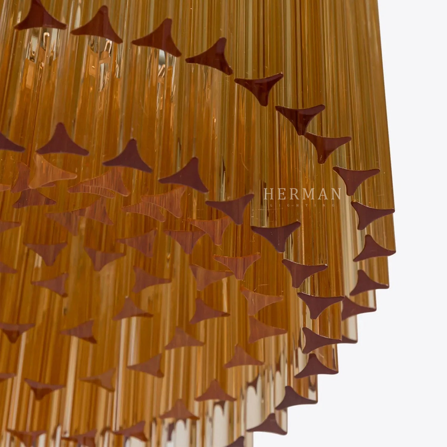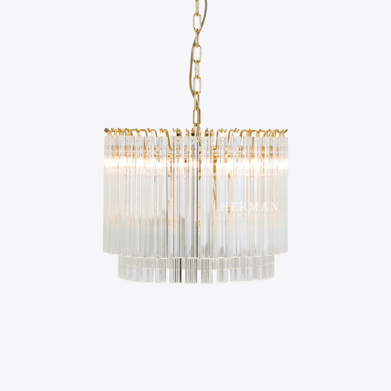 The Amaro chandeliers feature layers of mid-century inspired tri-style glass prisms, making them the ideal centerpiece for smaller spaces like living rooms, dining areas, or lobbies.