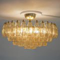 This Prismatico Glass Chandelier in Light Amber features 91 blown glass elements. The design incorporates pencil-shaped glass elements arranged to form a compact barrier creating a seamless appearance and a loating glass effect. Finished in warm satin brass, this chandelier can be installed flush or with an optional chain.he light amber glass provides a subtle glow. Customization options are available, contact us.