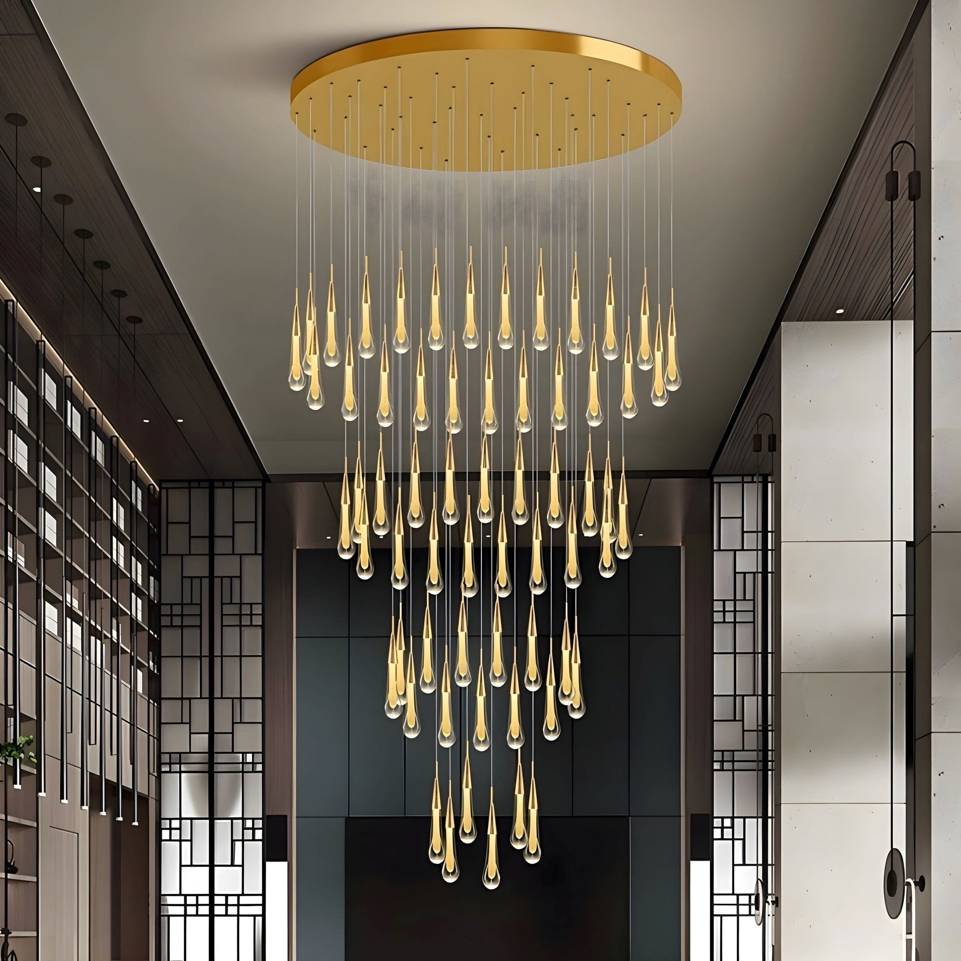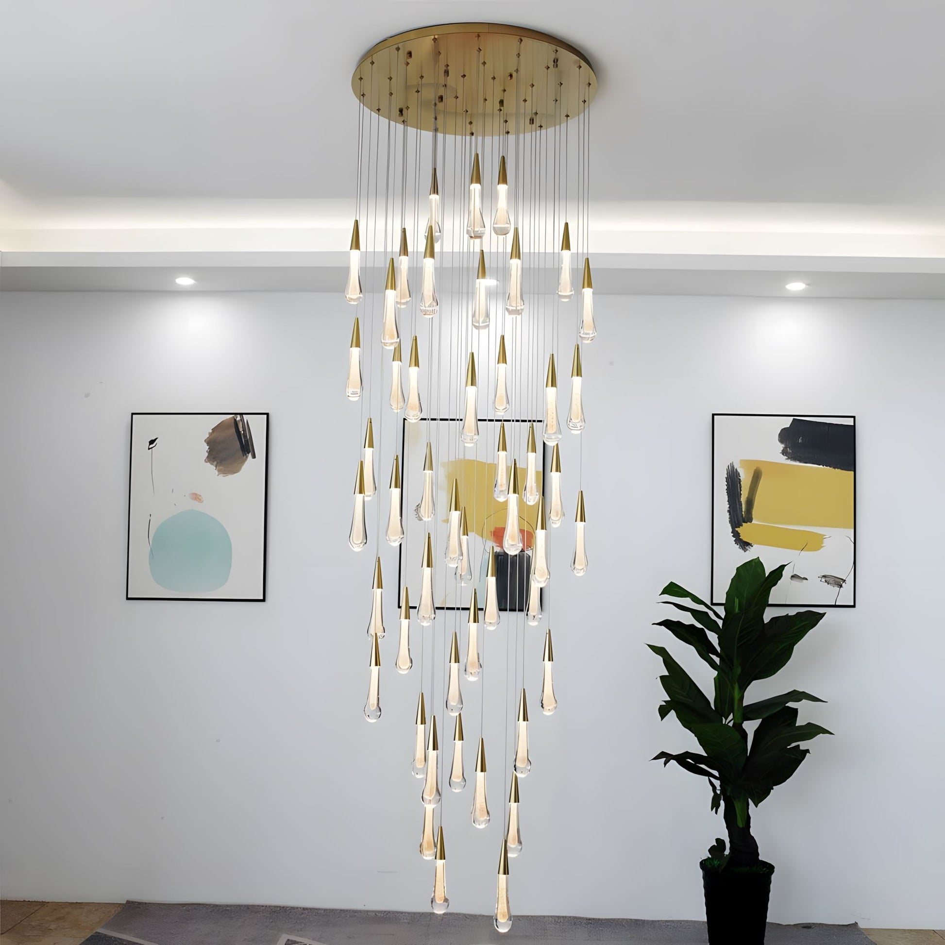 This modern-styled chandelier with sparkling LED crystal raindrops dangling from a gold canopy will bring elegance and charm to any home decor. Designed to be hung from high ceilings, the warm glow from this contemporary light fixture will illuminate your home and brighten your day. This lovely gold and crystal chandelier will double as a gorgeous work of art hanging from a high ceiling and a focal point for your family room, stairway, entryway or foyer.This chandelier does need to be hard-wired. Professional installation is recommended.