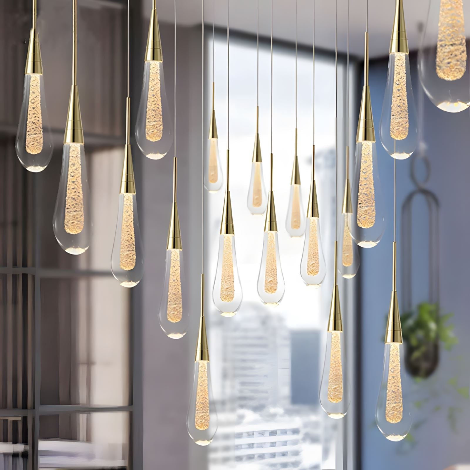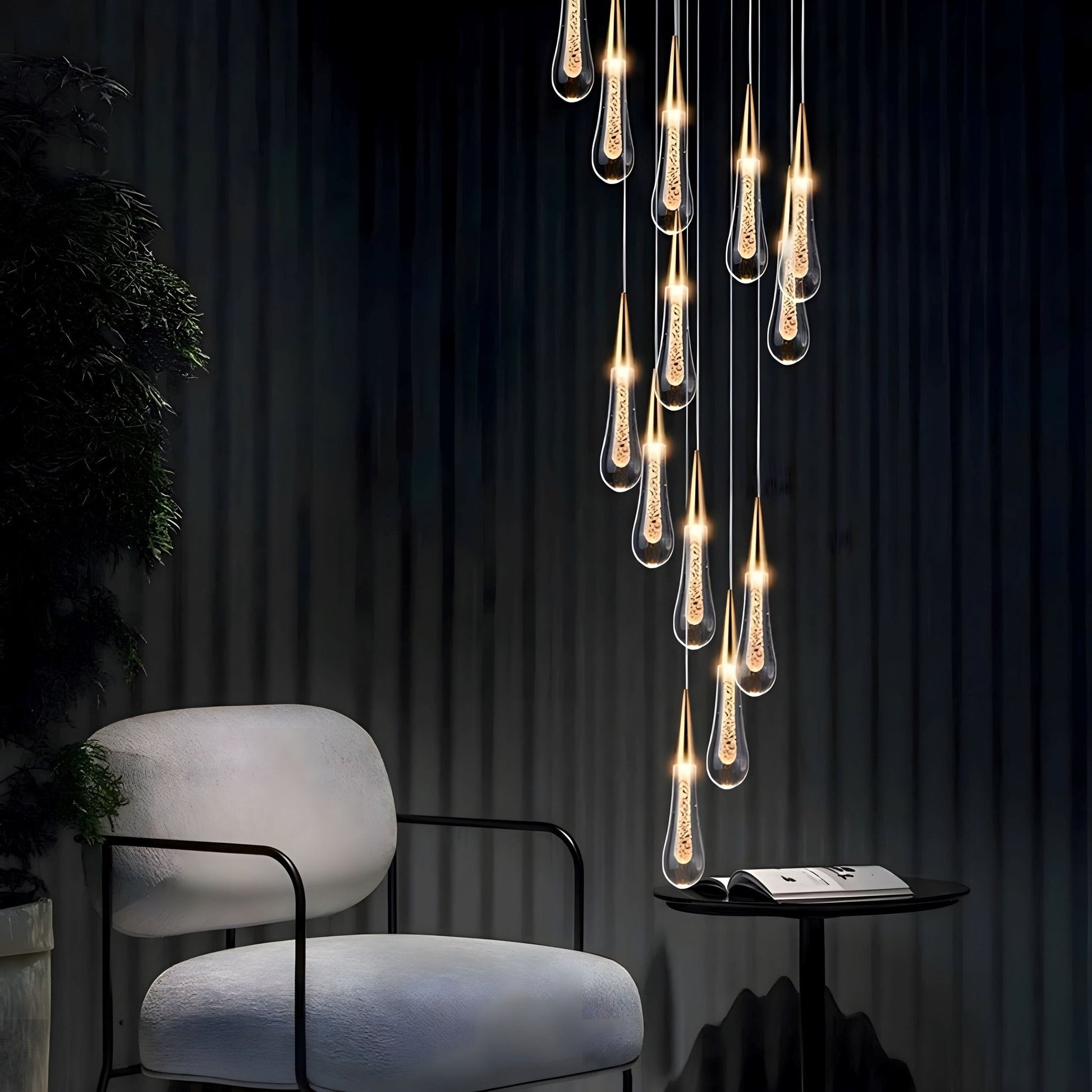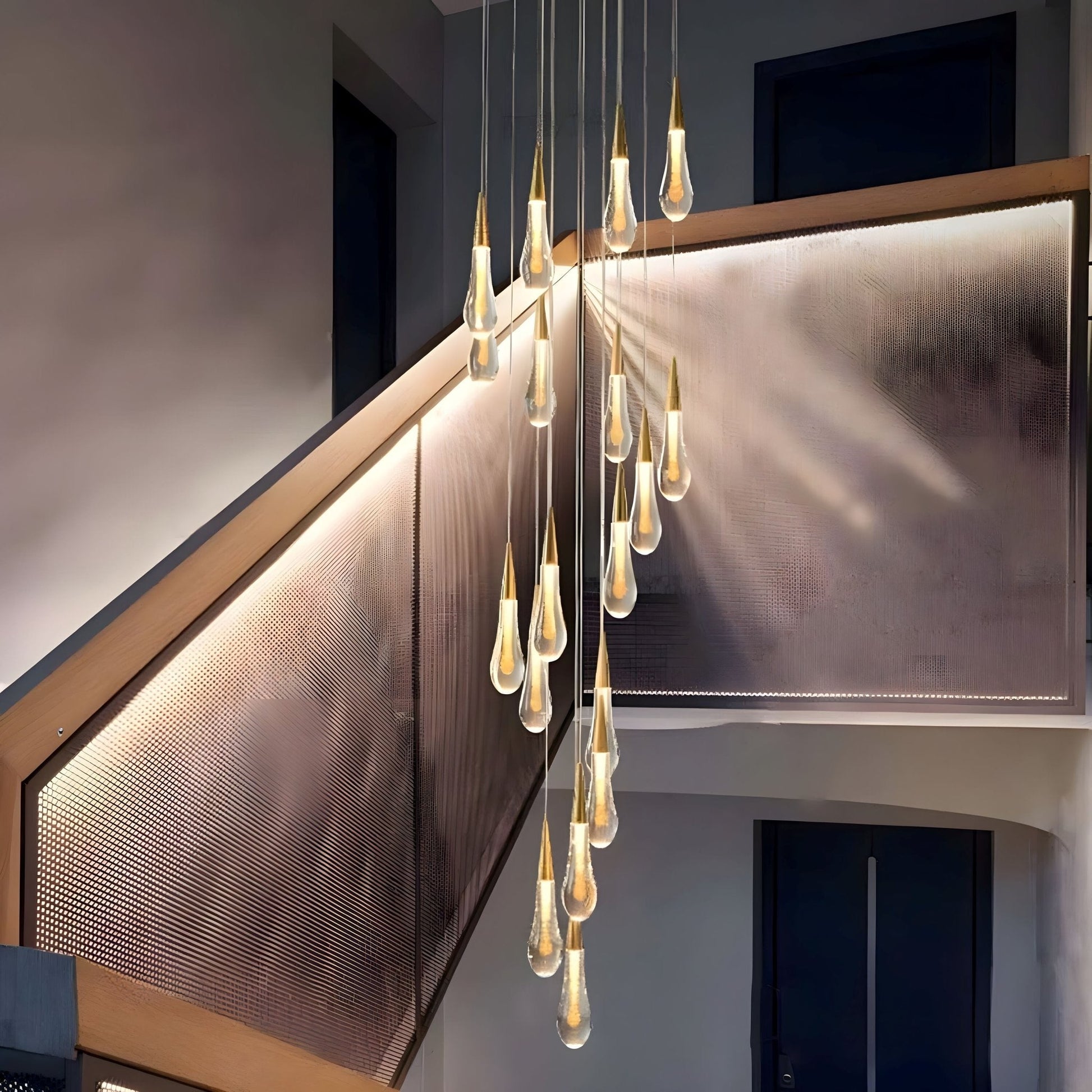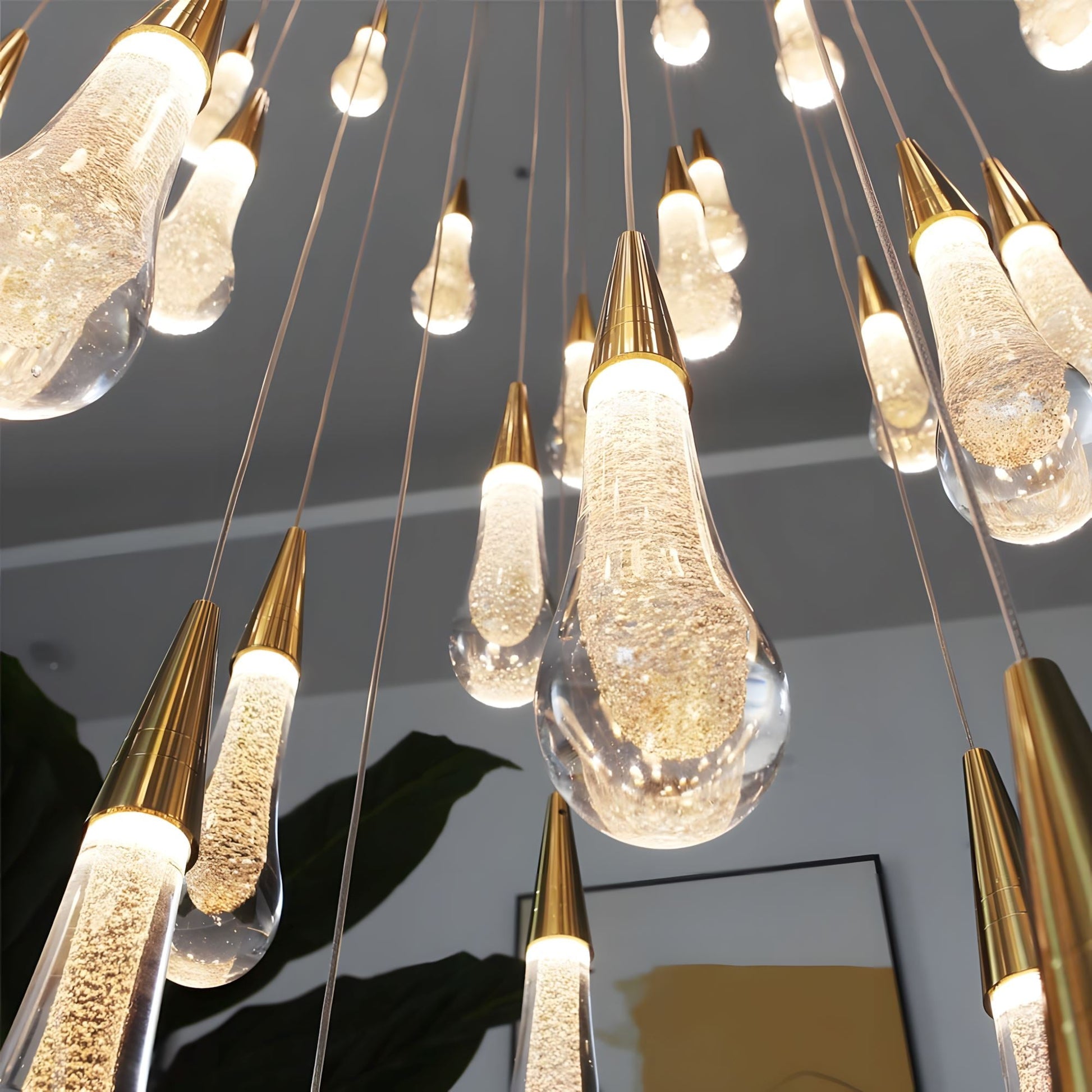 This chandelier is an amazing, one-of-a-kind look. Each glass "water droplet" glows and helps create an amazing atmosphere. These can be used as a pendant light in a room or to hang down a stairway.