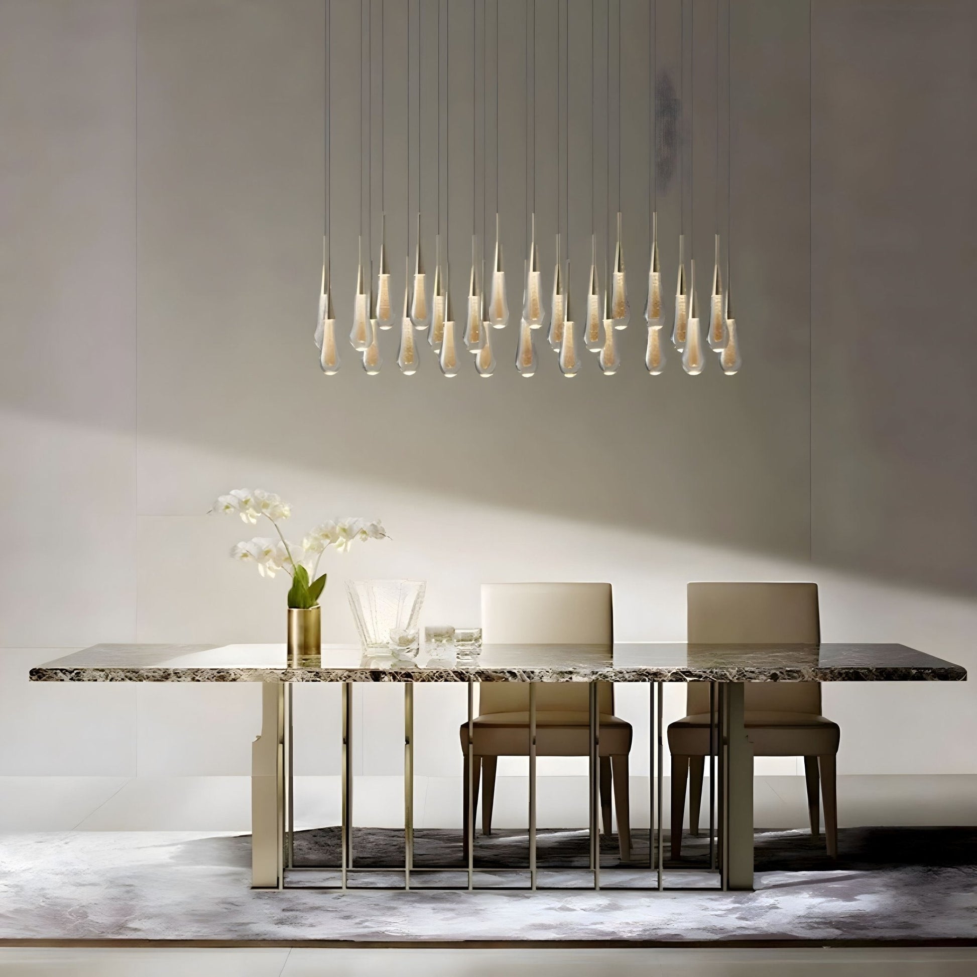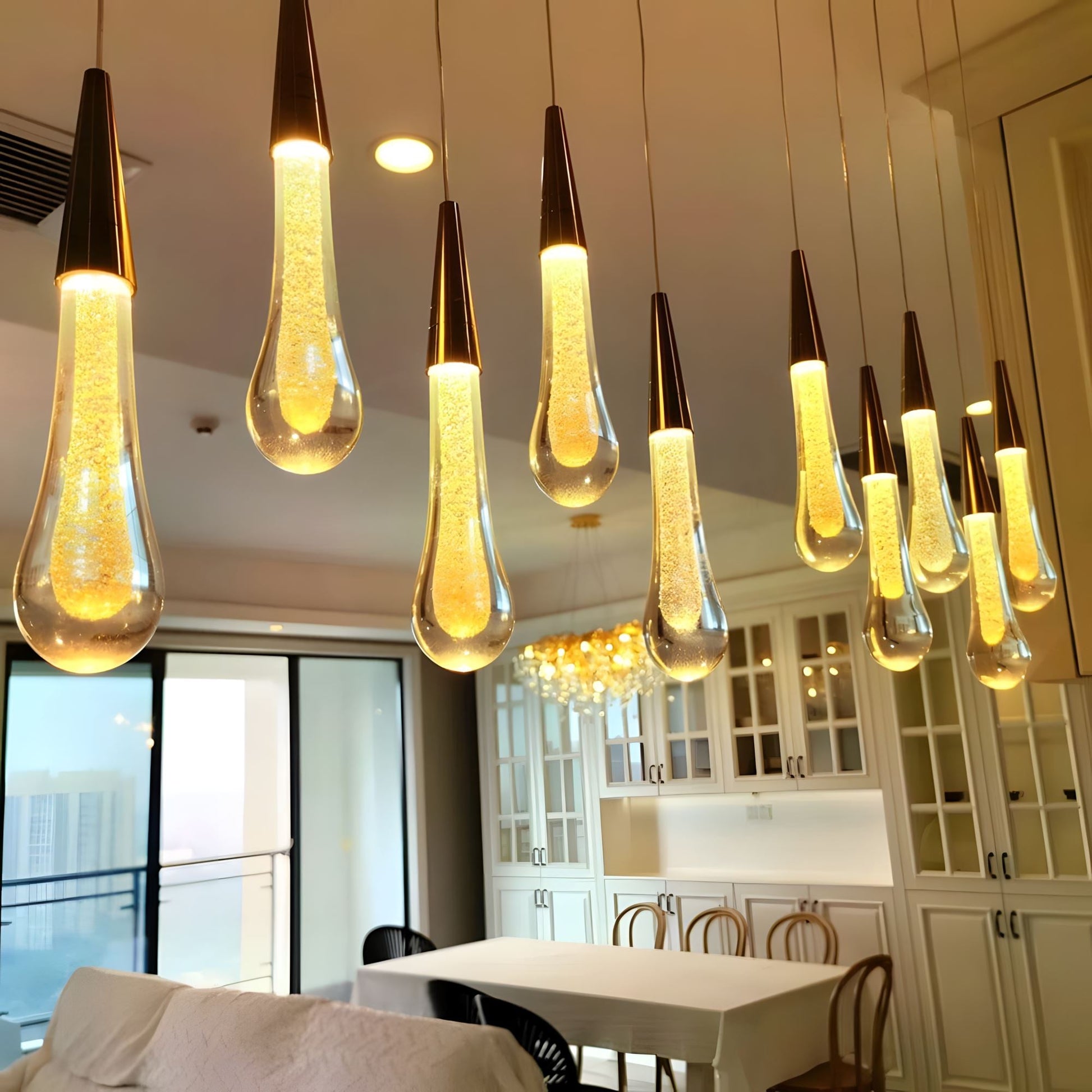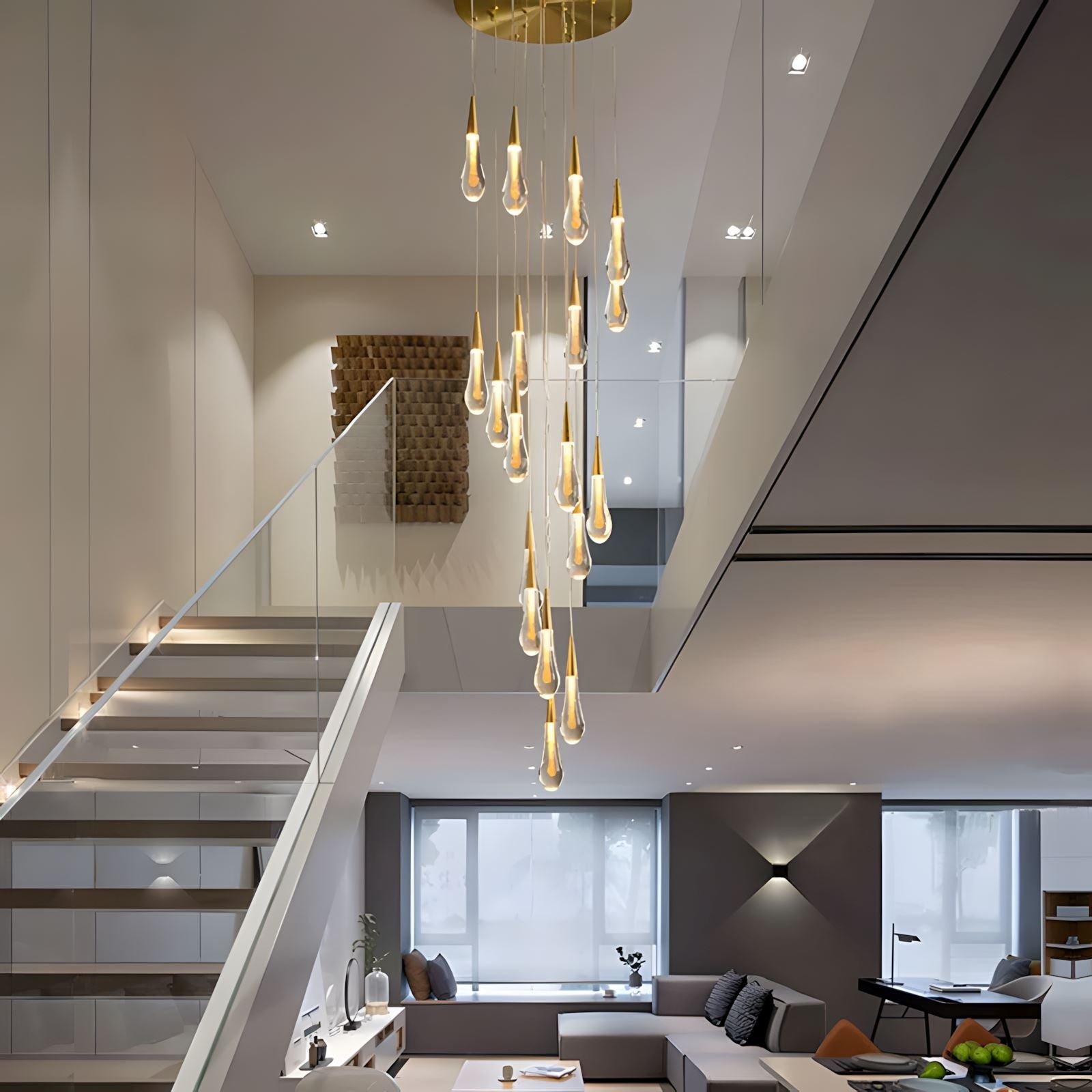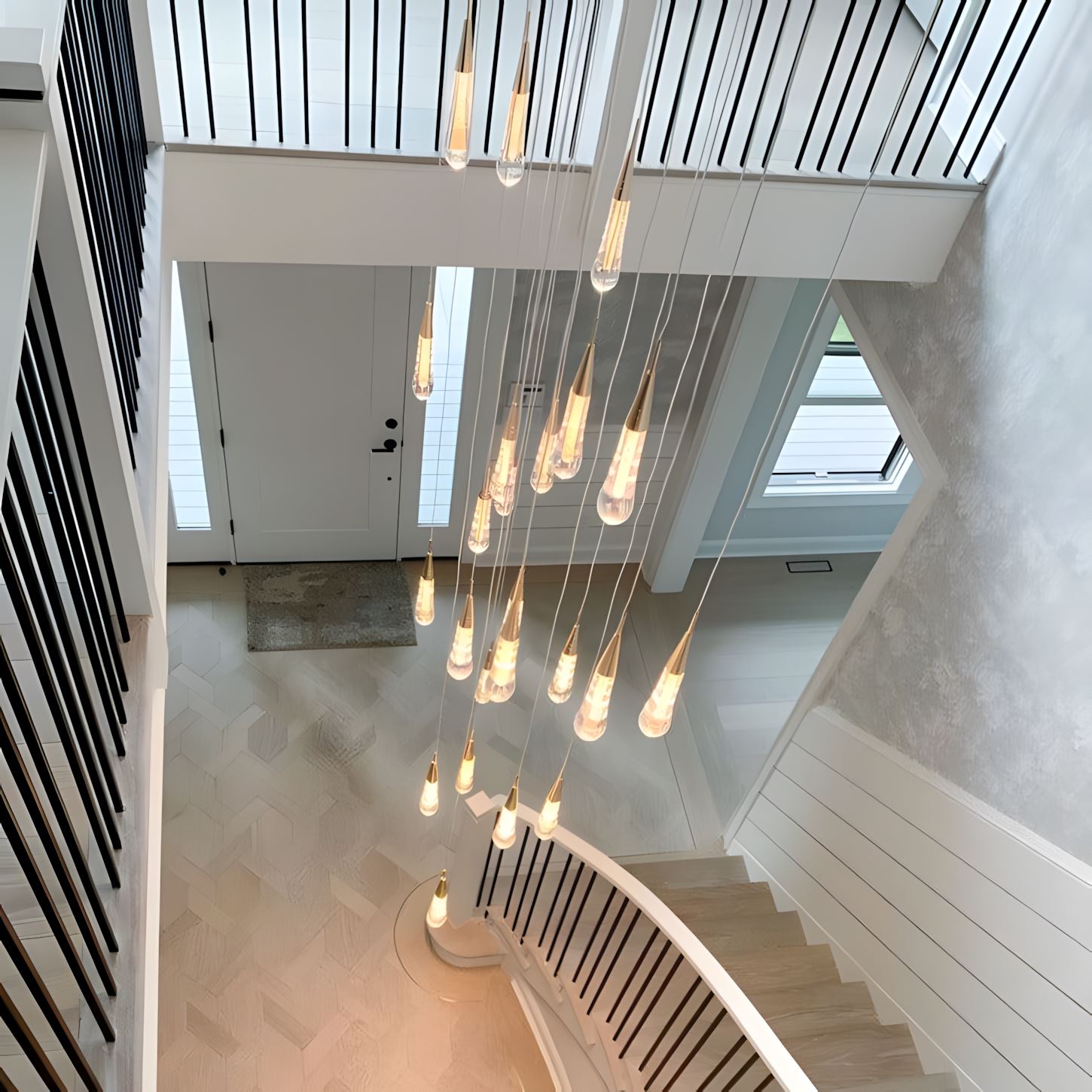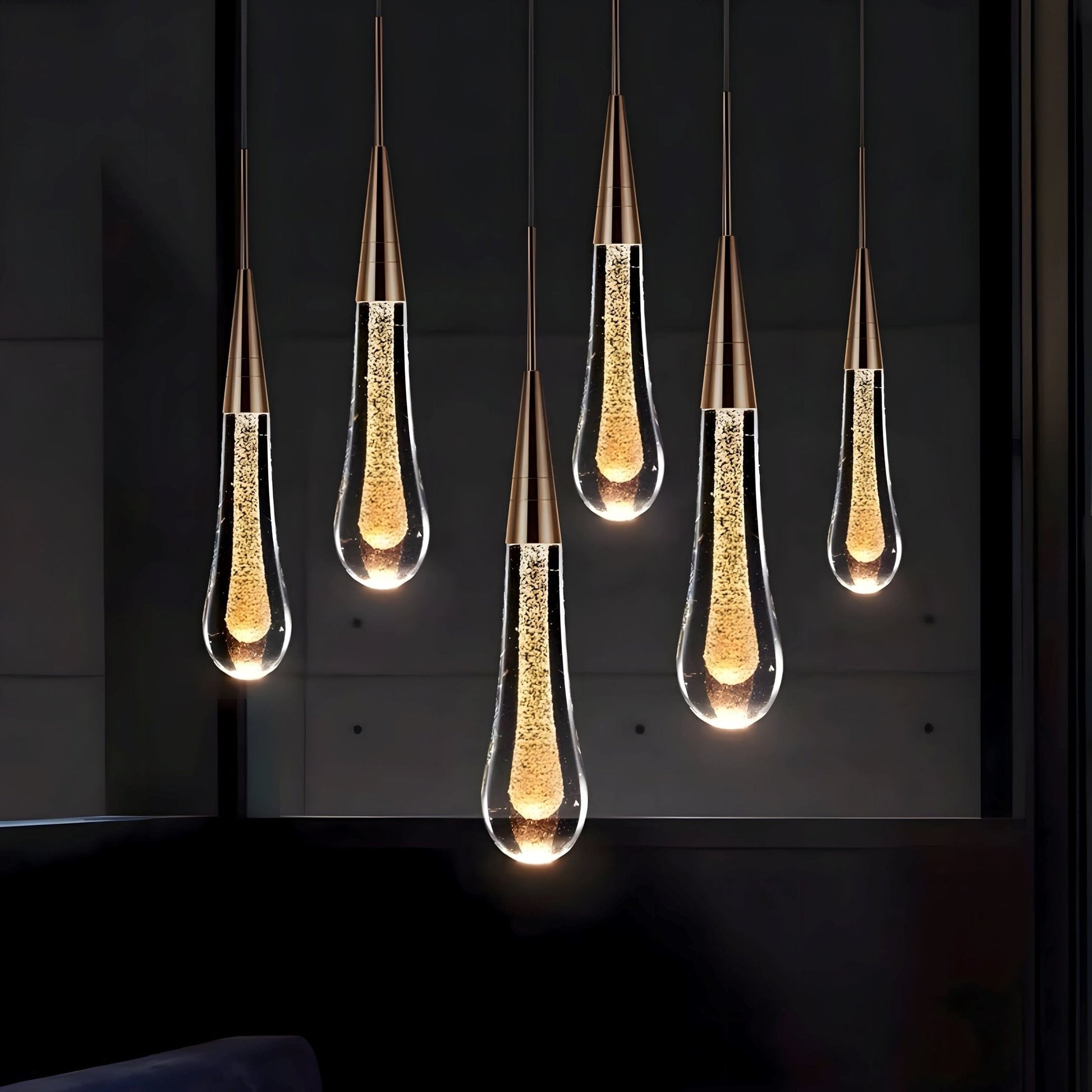This chandelier is an amazing, one-of-a-kind look. Each glass "water droplet" glows and helps create an amazing atmosphere. These can be used as a pendant light in a room or to hang down a stairway.
