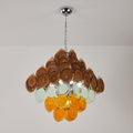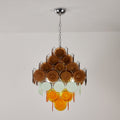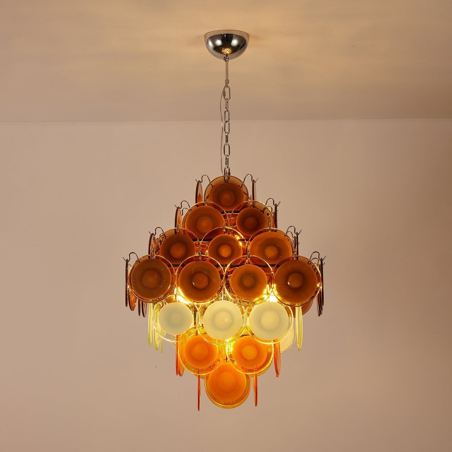 Bring a touch of vintage glamour to your space with the Hermanlamps Retro Glass Disc Chandelier. This eye-catching design features multiple hand-blown glass discs in warm amber, brown, and soft pastel tones, layered to create a luxurious cascade of color and light. Suspended from a sturdy chain with a polished frame, the chandelier creates a rich, ambient glow while evoking the charm of mid-century design. Perfect for dining rooms, living areas, or stylish commercial spaces, this statement piece adds artistic flair and timeless sophistication to any interior.