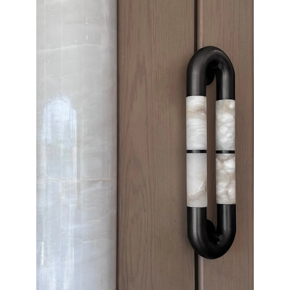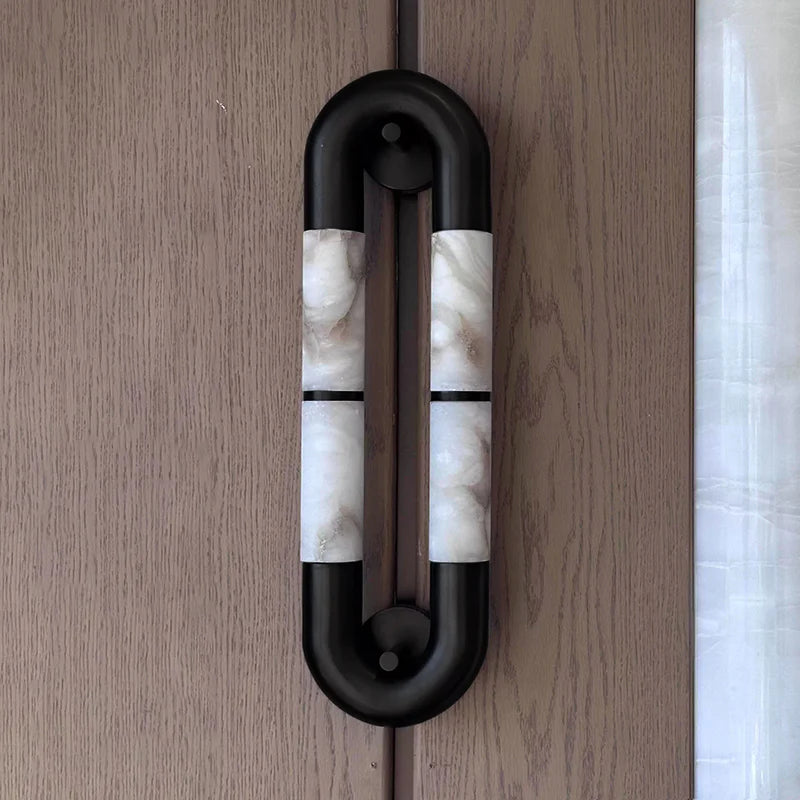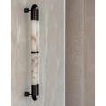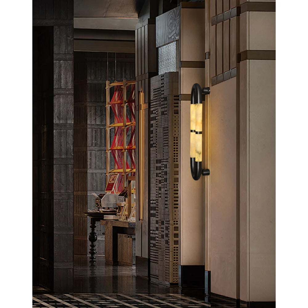 A sleek alabaster tube wall sconce framed in black stainless steel, designed for bathrooms, hallways, and modern interiors. The natural veining of alabaster diffuses a soft, ambient glow, creating a refined atmosphere. Perfect for luxury homes, boutique hotels, and contemporary spaces seeking a minimalist yet sculptural lighting solution.
