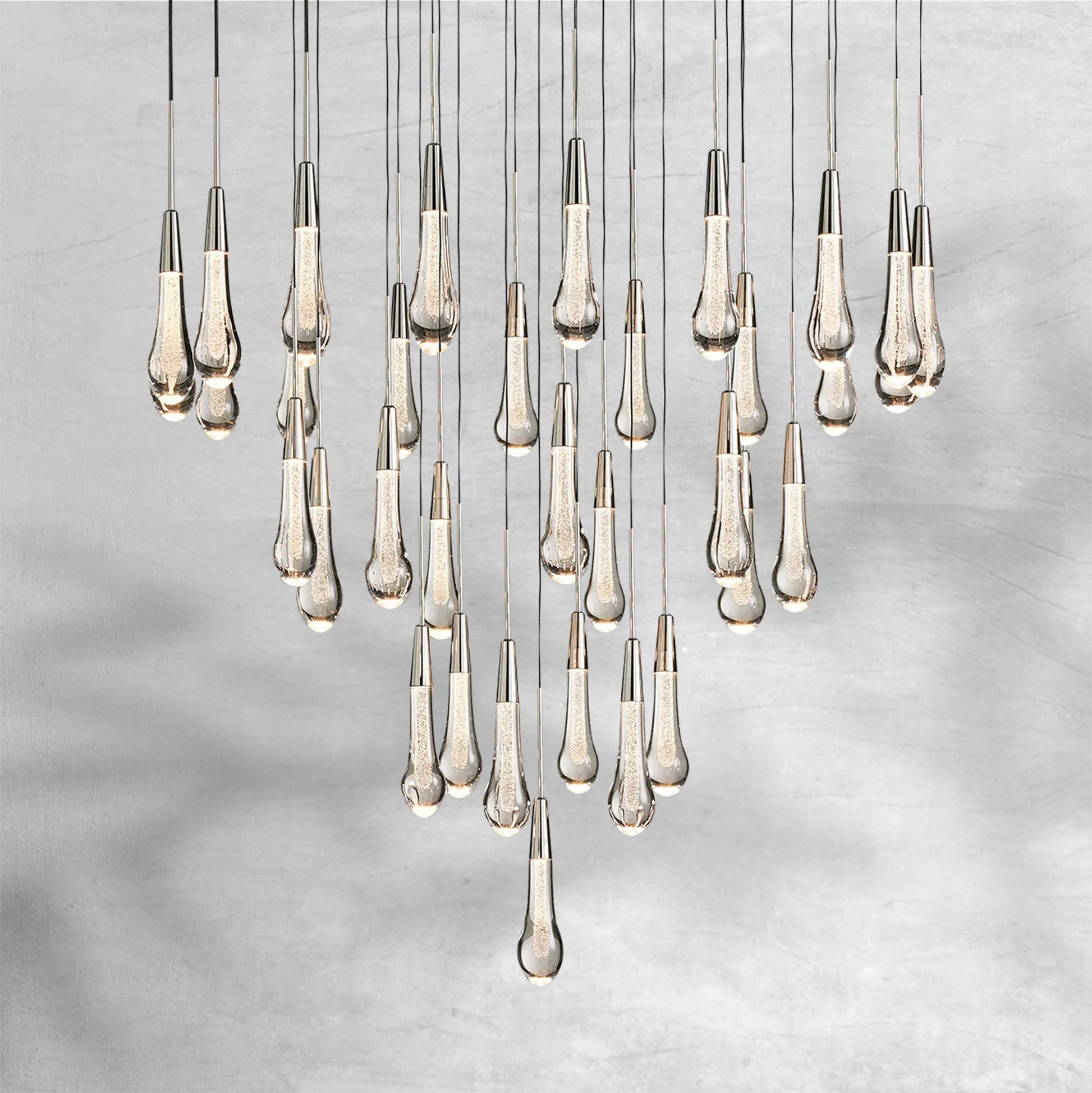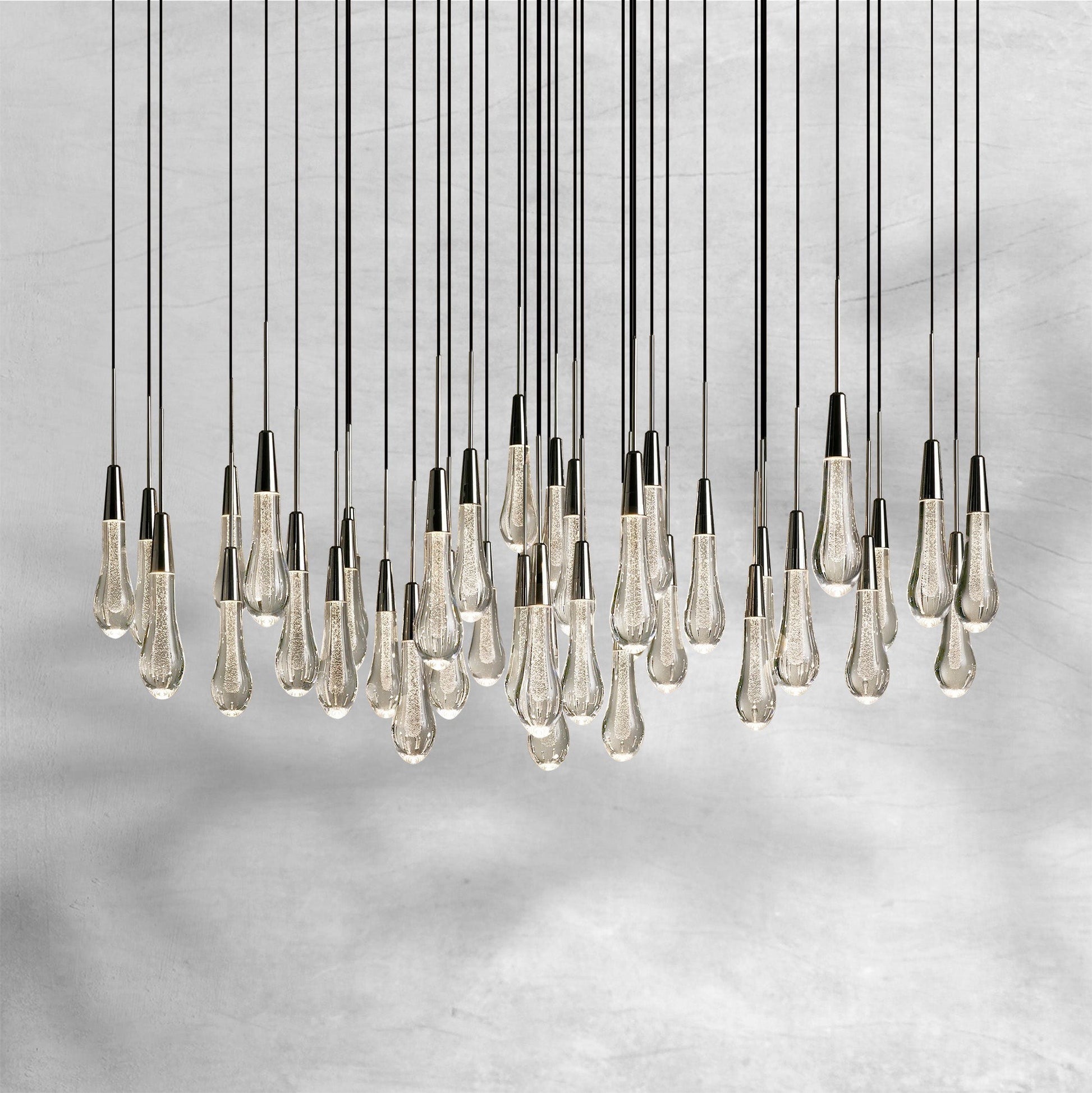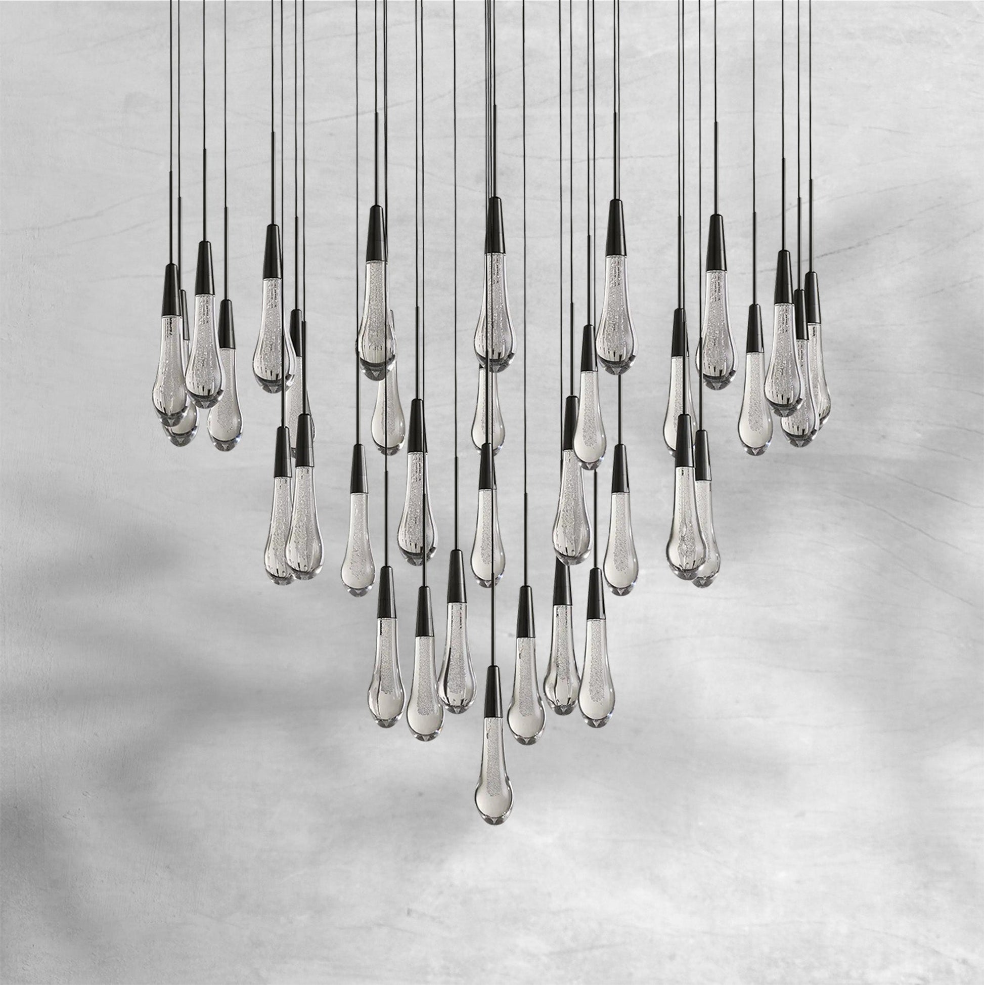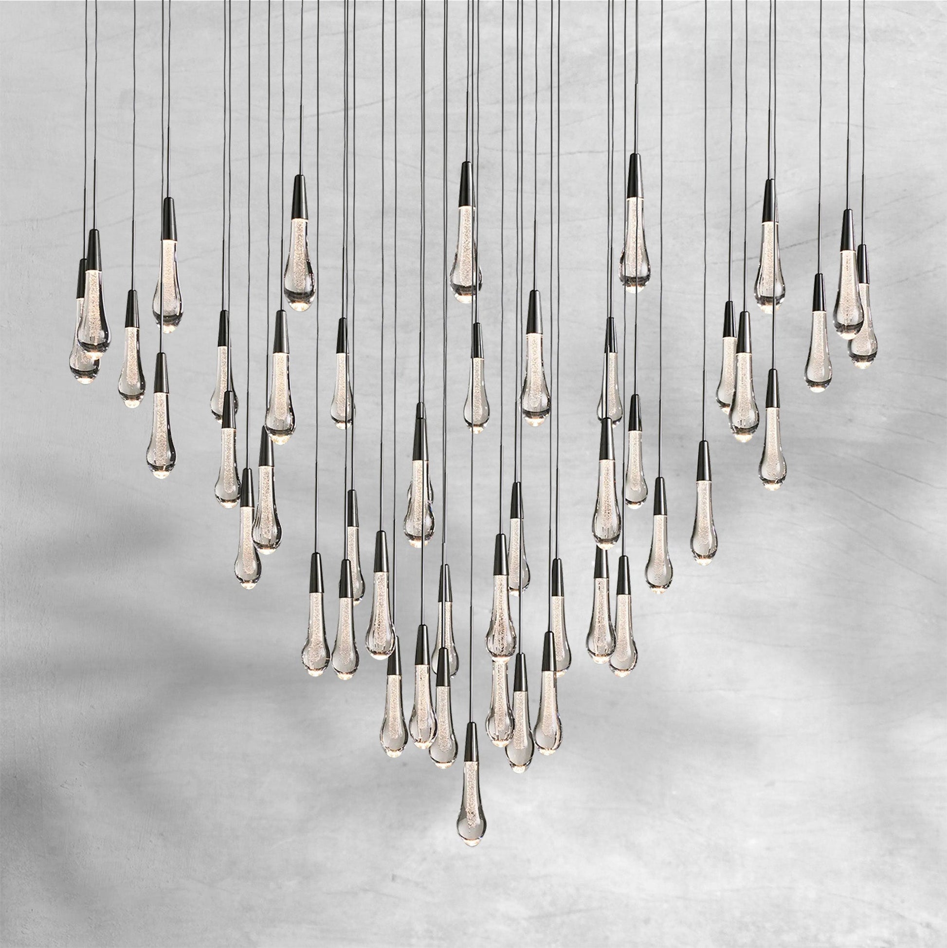 Featuring adjustable black PVC cords cascading into integrated LED lights handcrafted from seeded glass, our Soltaire Lighting Collection mimics the look of a fallen raindrop.