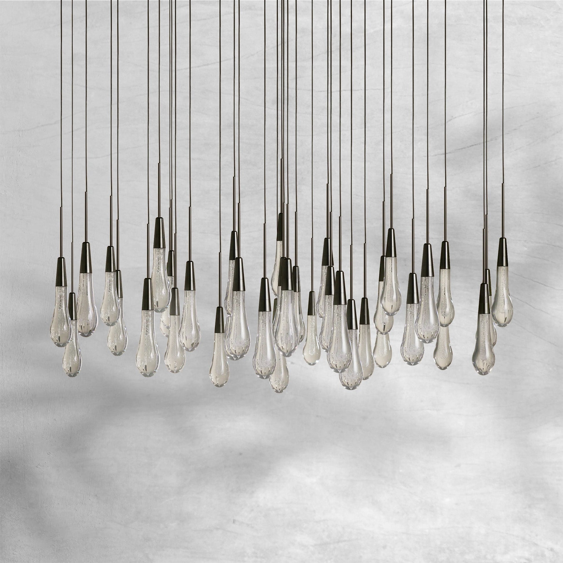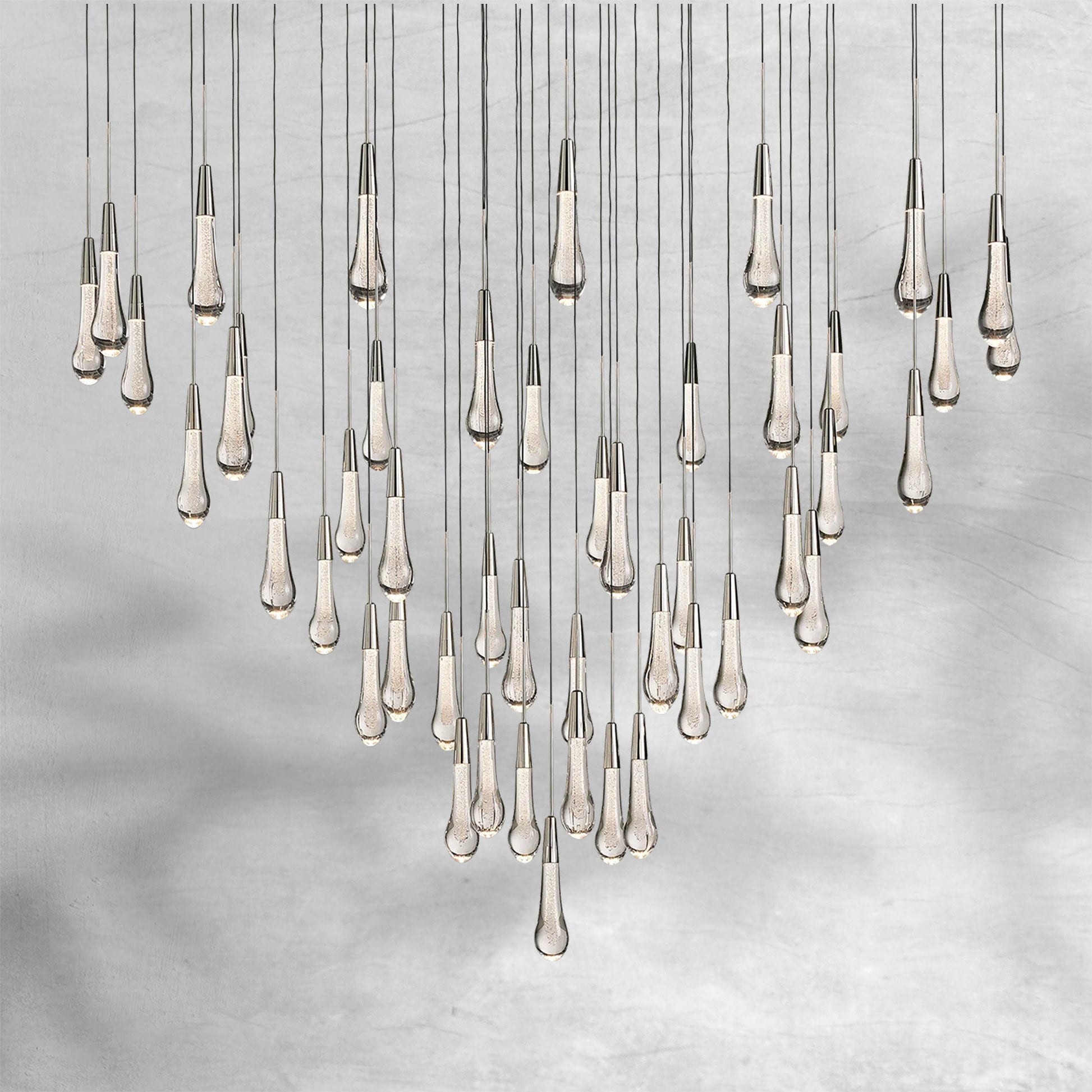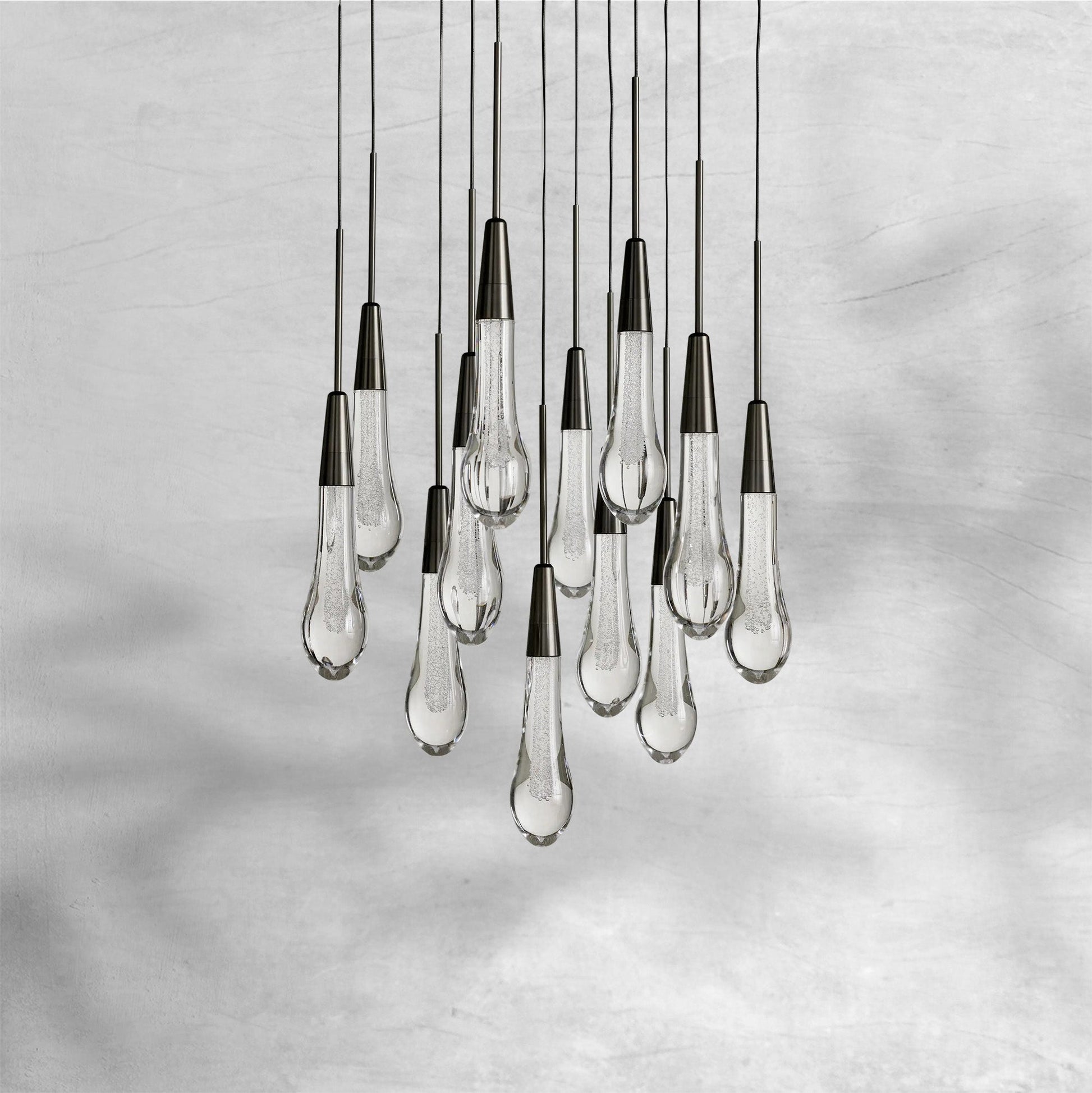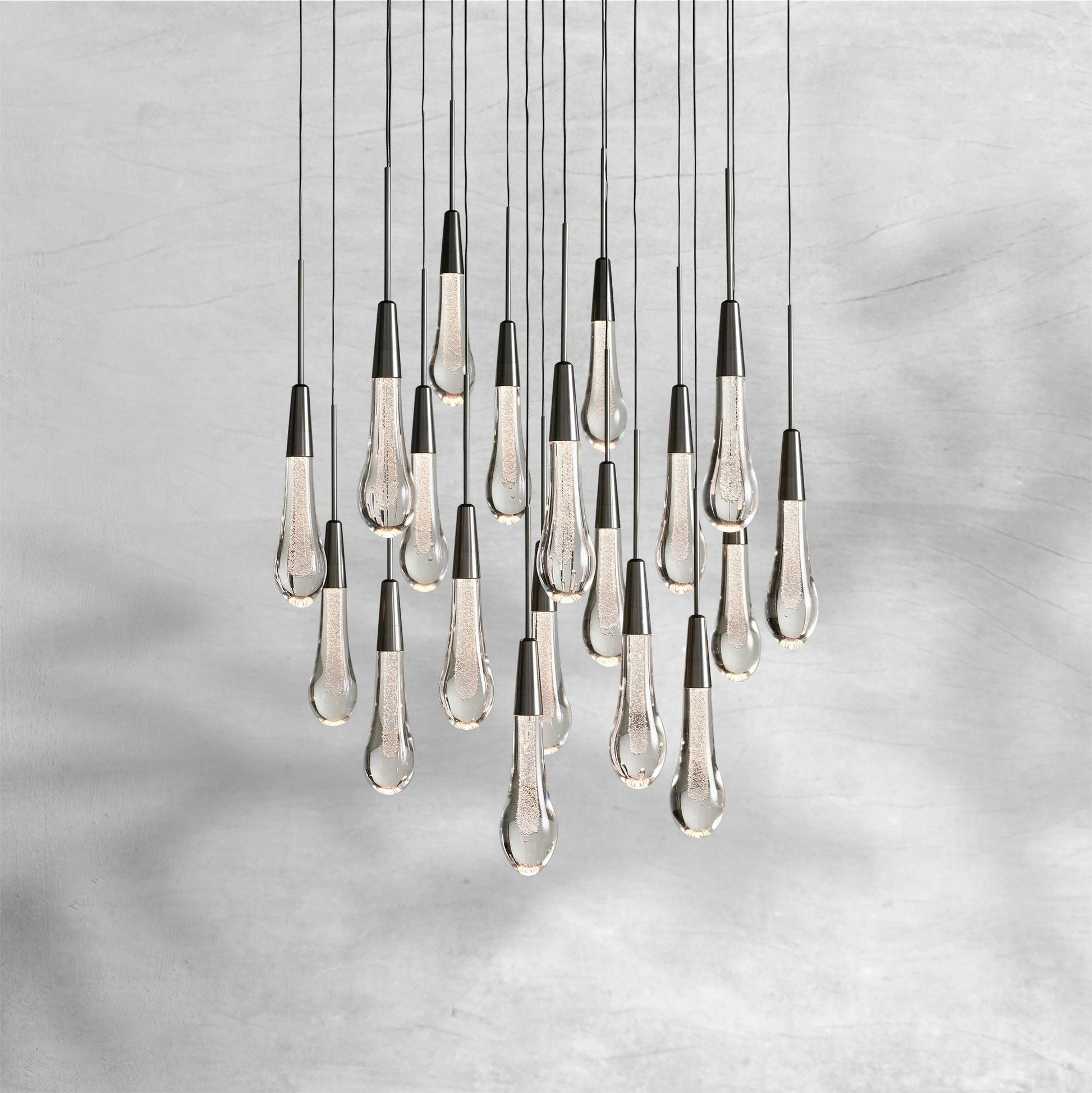 Featuring adjustable black PVC cords cascading into integrated LED lights handcrafted from seeded glass, our Soltaire Lighting Collection mimics the look of a fallen raindrop.