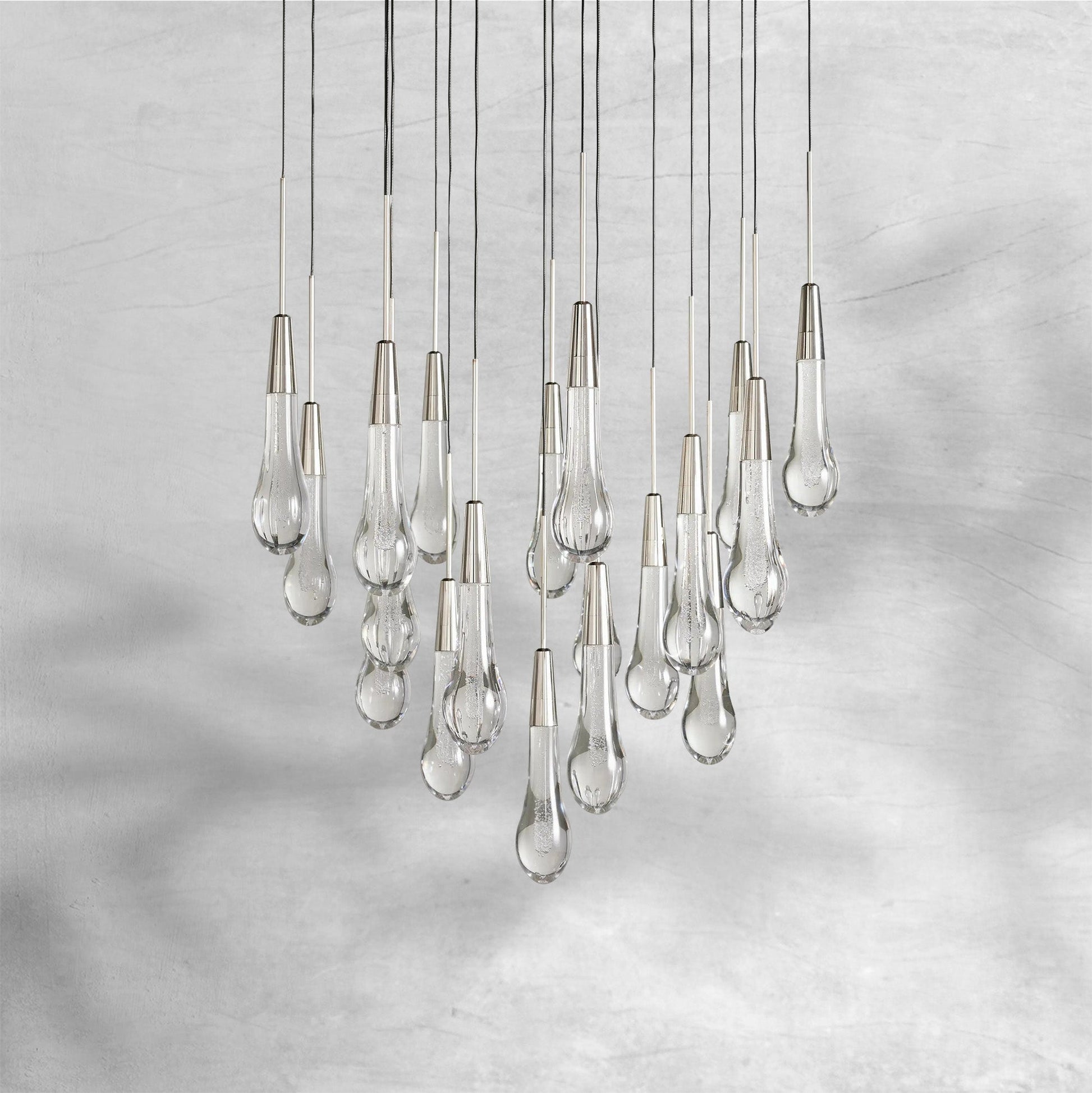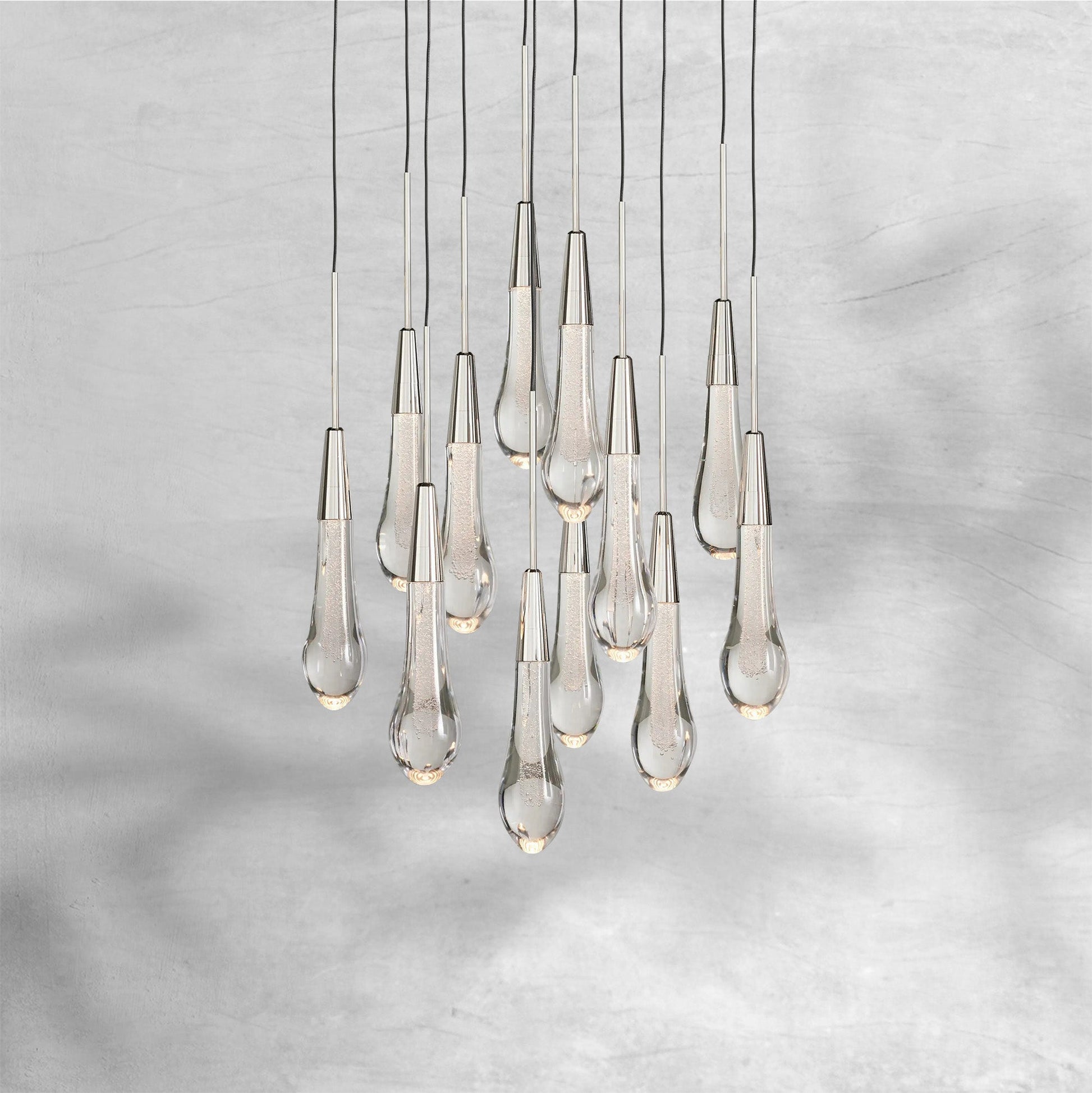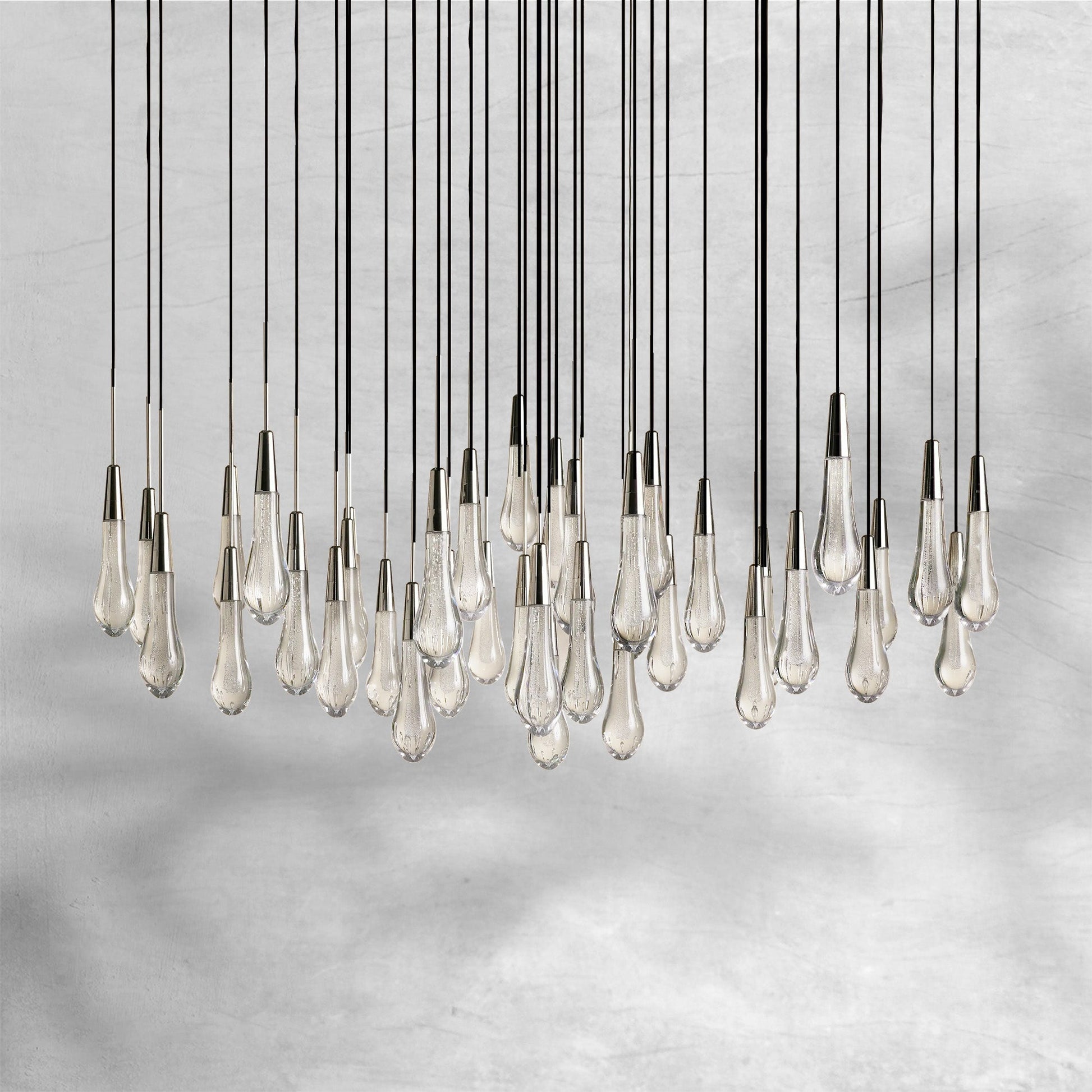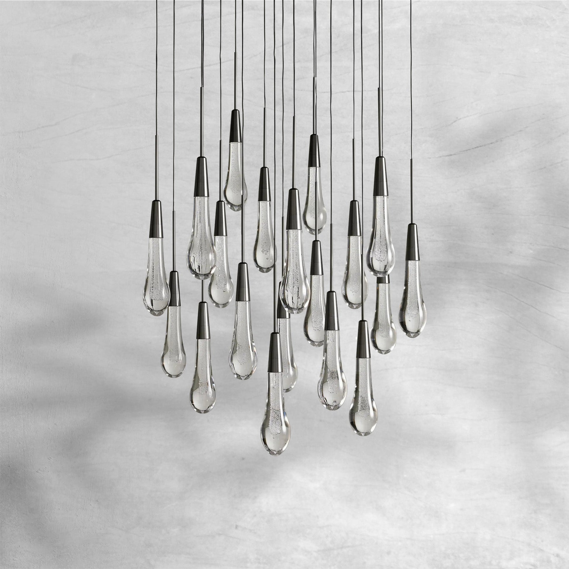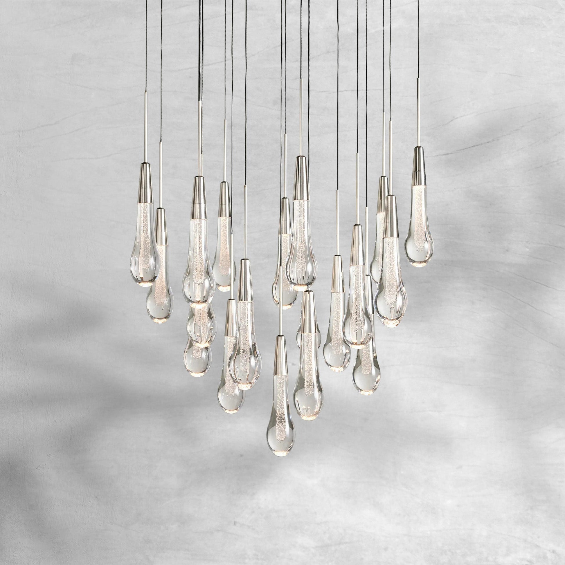Featuring adjustable black PVC cords cascading into integrated LED lights handcrafted from seeded glass, our Soltaire Lighting Collection mimics the look of a fallen raindrop.