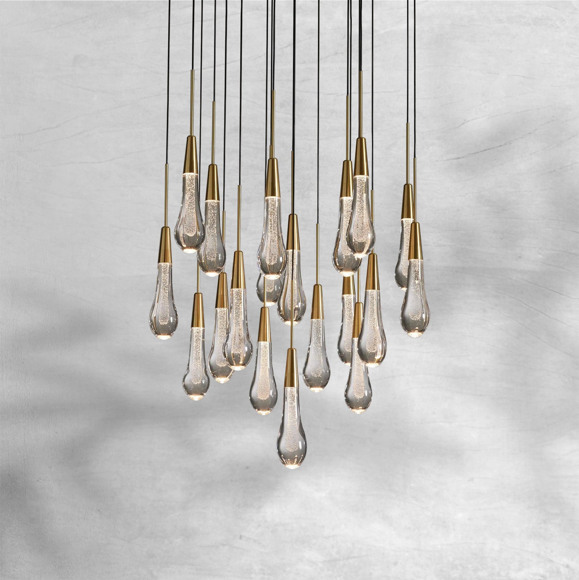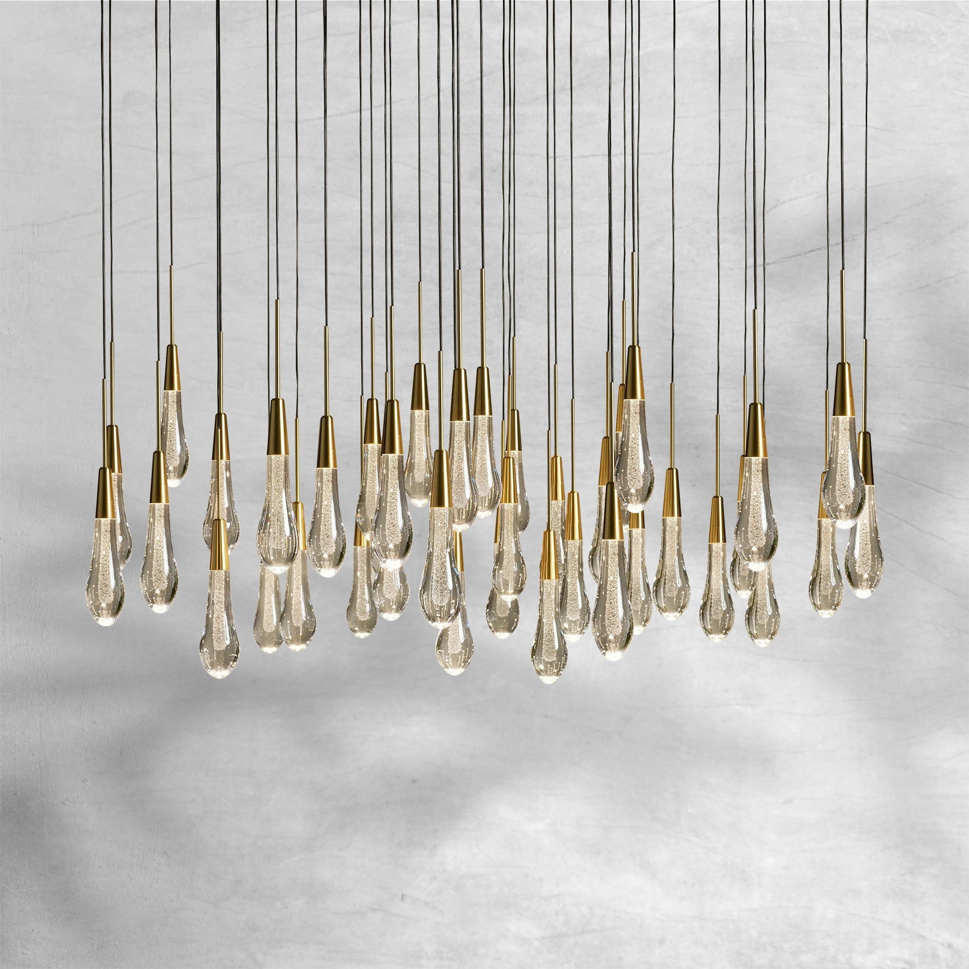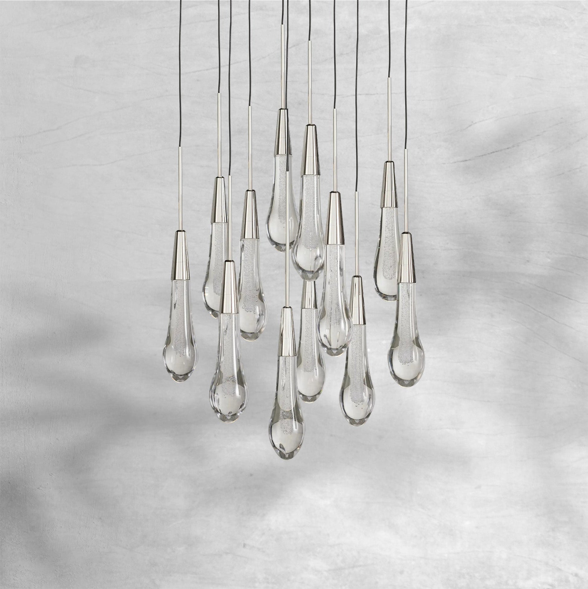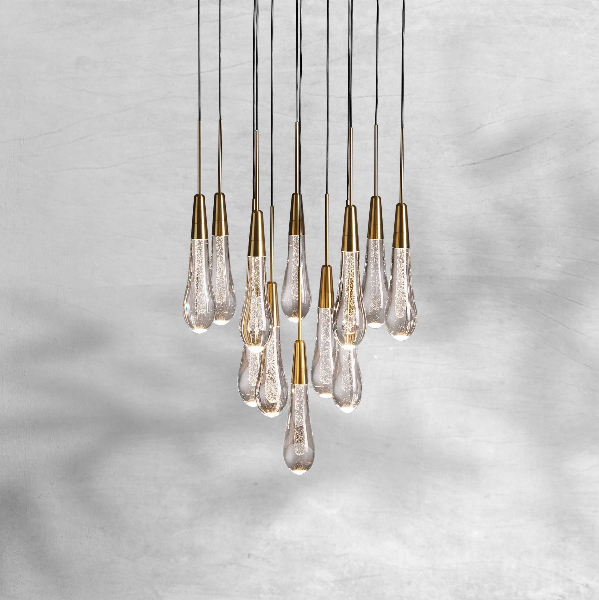 Featuring adjustable black PVC cords cascading into integrated LED lights handcrafted from seeded glass, our Soltaire Lighting Collection mimics the look of a fallen raindrop.
