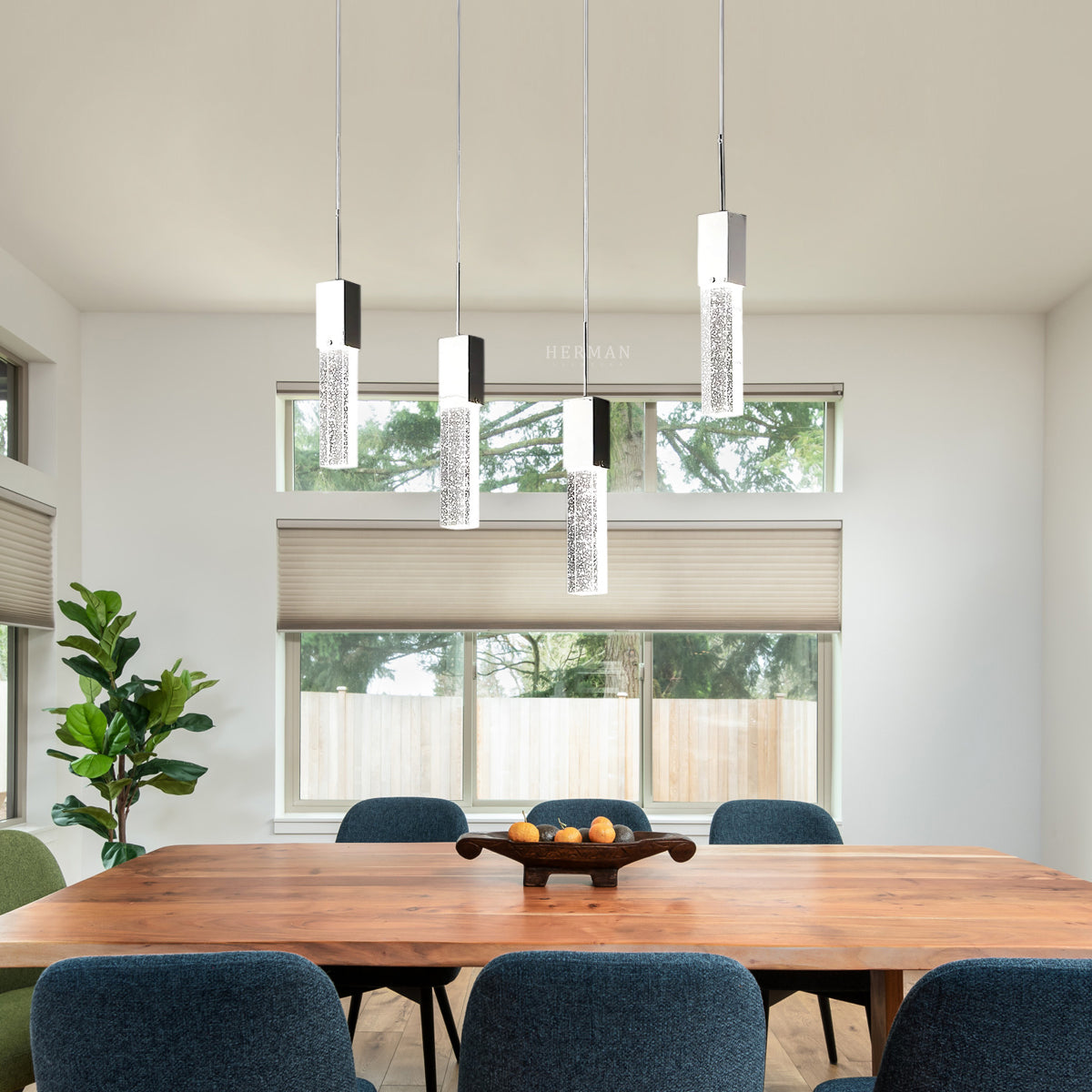 The four crystal hanging chandelier light is perfect and versatile for many different spaces. The crystal pendants have floating bubbles that give it that sparkling look and reflect in a luxurious and glamorous way. Each wire of each crystal is adjustable to your desire. Perfect over a counter or kitchen island. This is one of our best seller products from our crystal collection.