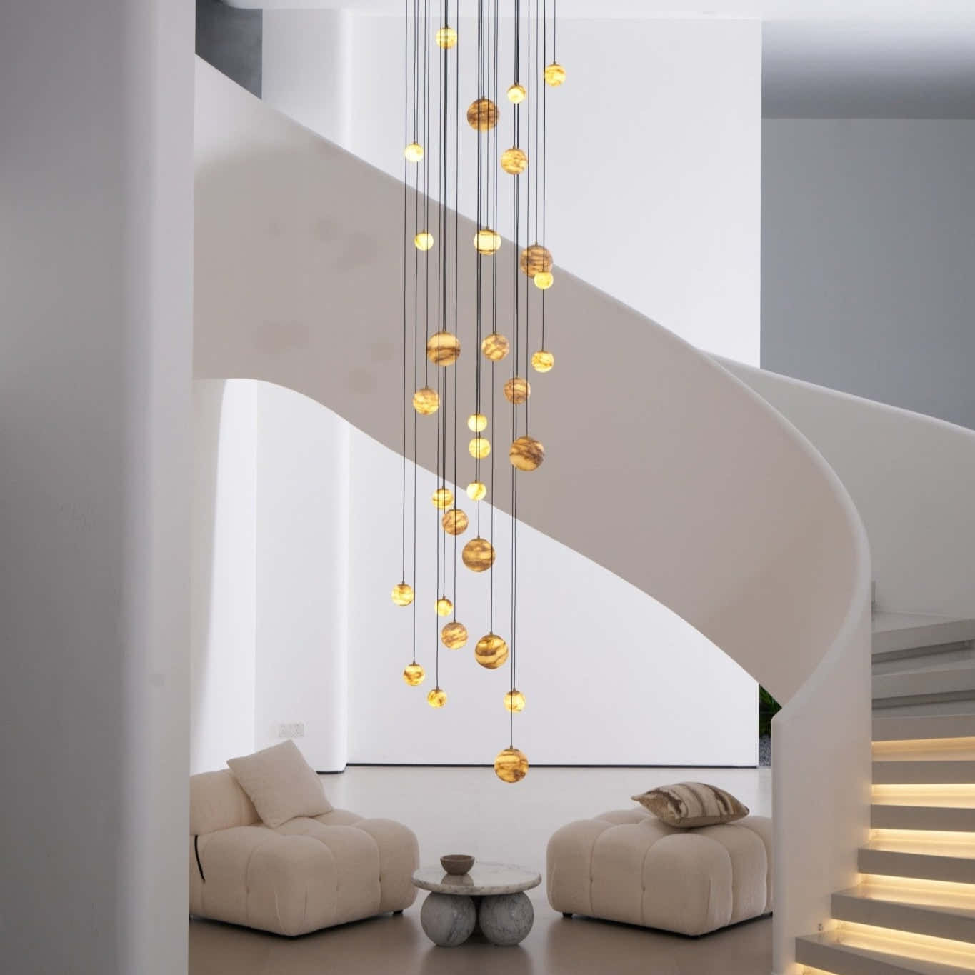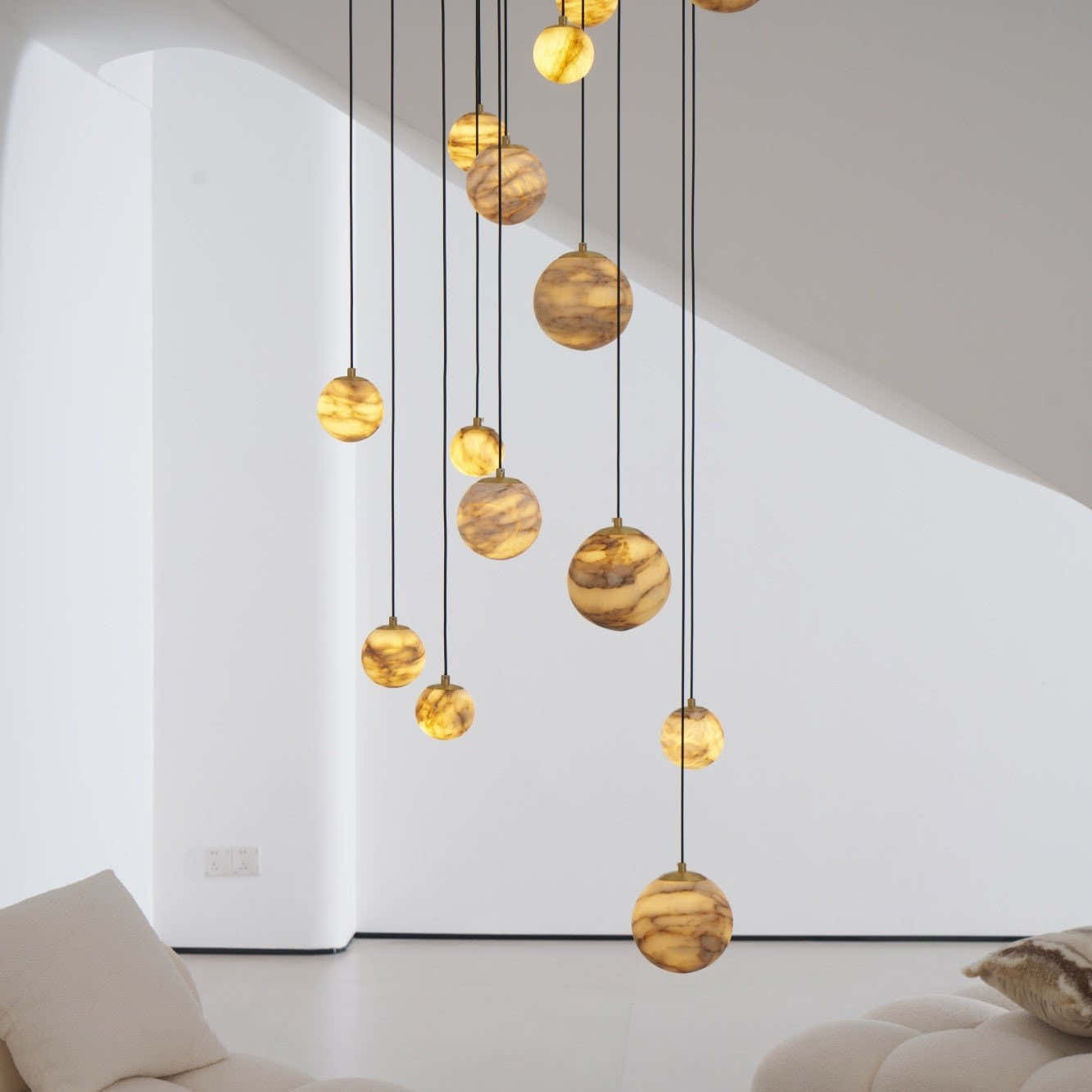 The Sultana Alabaster Cluster Chandelier by dekorfine artfully combines natural alabaster spheres with a minimalist metal canopy, creating a dynamic cascade of softly glowing orbs. Each handcrafted sphere highlights unique veining, adding organic texture and depth. Perfect for expansive spaces like foyers or stairwells, this chandelier delivers a sophisticated ambient glow that elevates any interior with refined elegance and sculptural presence.
