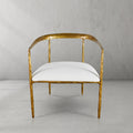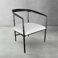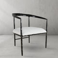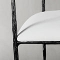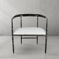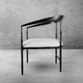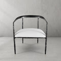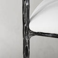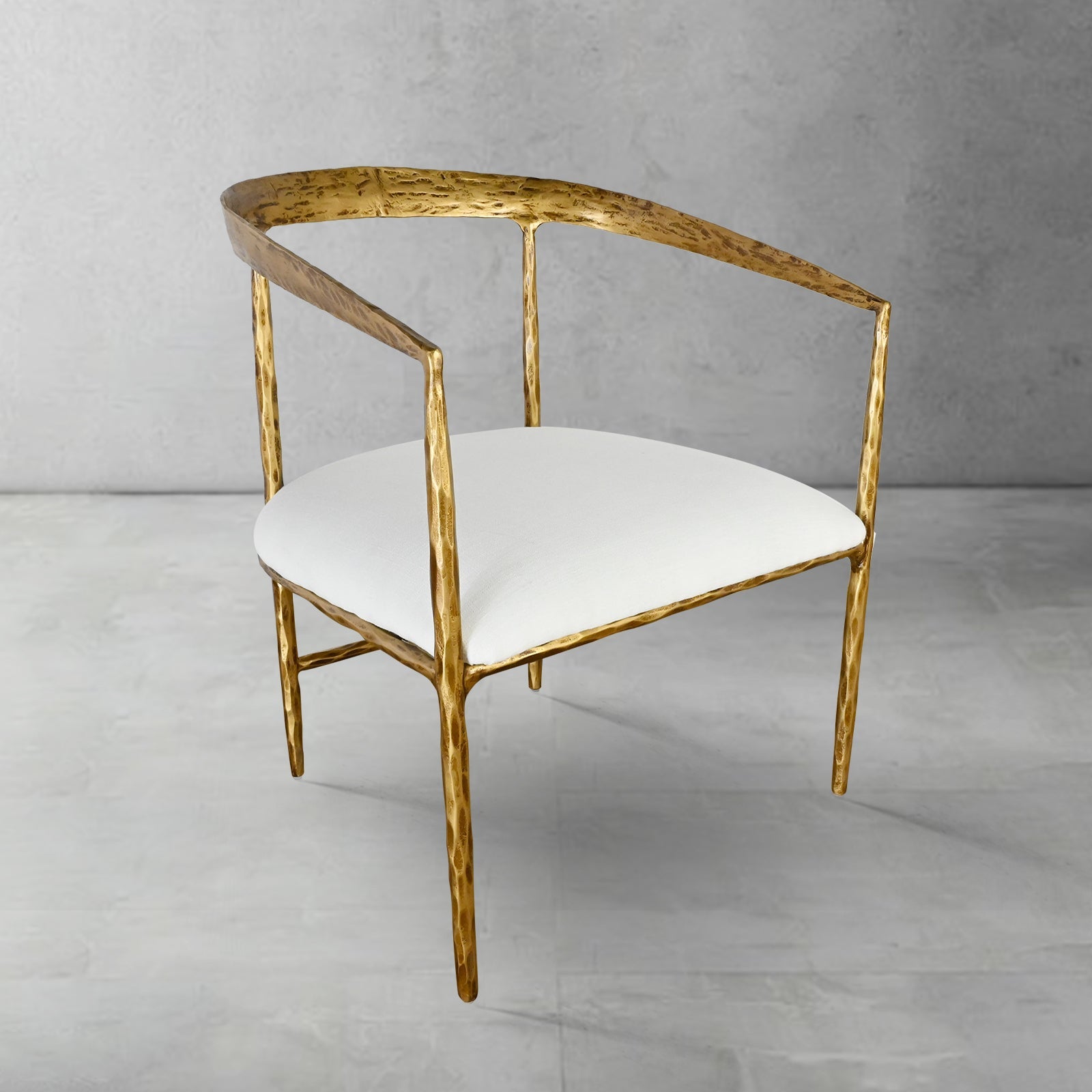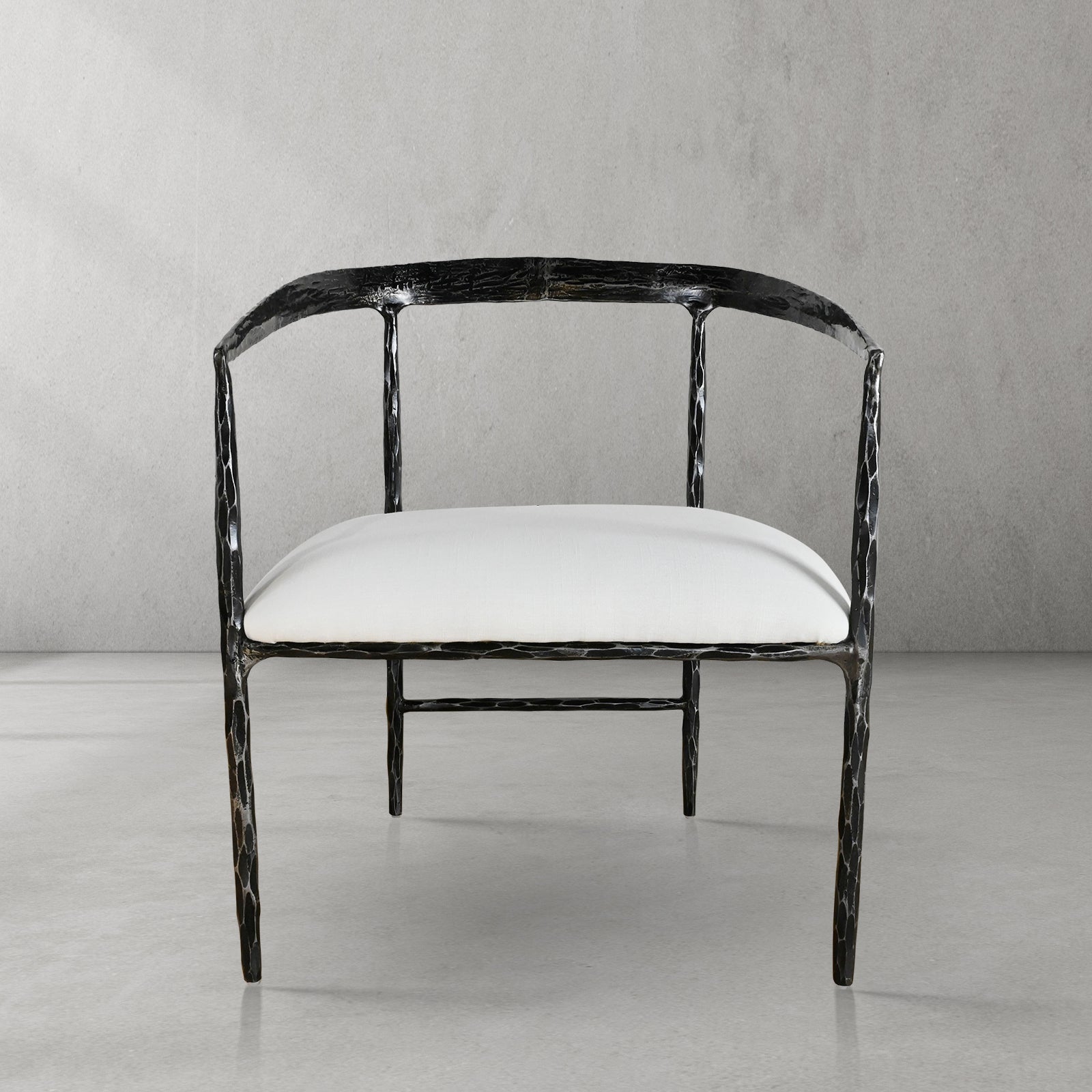 Our chair from the rustic sensibility of a hand-forged metal base with tailored upholstery. Employing an ancient fabrication process, artisans hand hammer the metal bars to reveal an alive, imperfect and organic texture, a counterpoint to the frame's slender, tapered silhouette.
