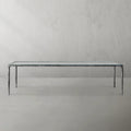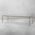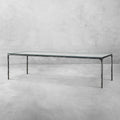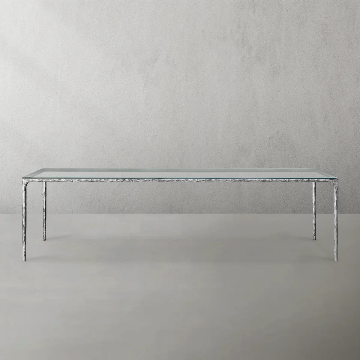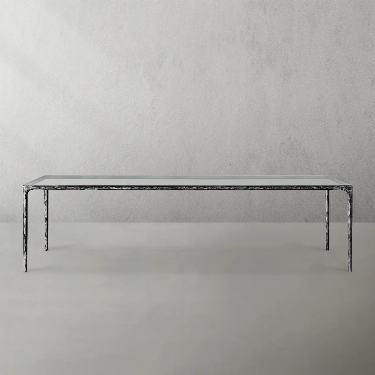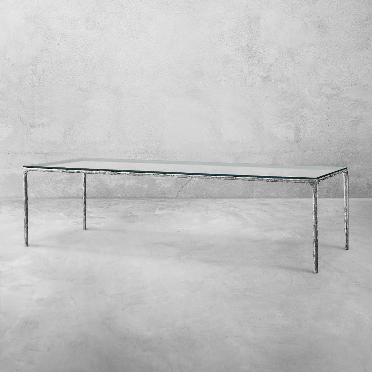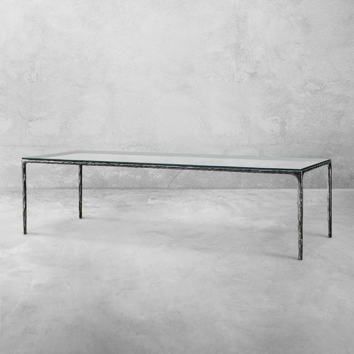 Our collection by the rustic sensibility of hand-forged metal with clean tempered glass. Employing an ancient fabrication process, artisans hand hammer the metal bars to reveal an alive, imperfect and organic texture. The pounded, tapered silhouettes are a rich counterpoint to the smooth, honed stone.