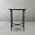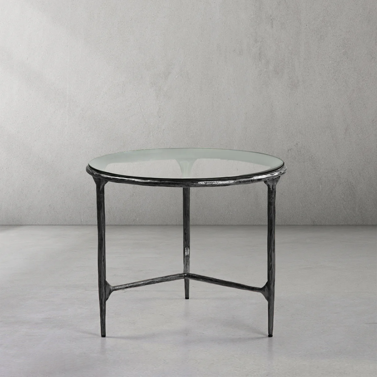 Our collection by the rustic sensibility of hand-forged metal with clean tempered glass. Employing an ancient fabrication process, artisans hand hammer the metal bars to reveal an alive, imperfect and organic texture. The pounded, tapered silhouettes are a rich counterpoint to the smooth, honed stone.