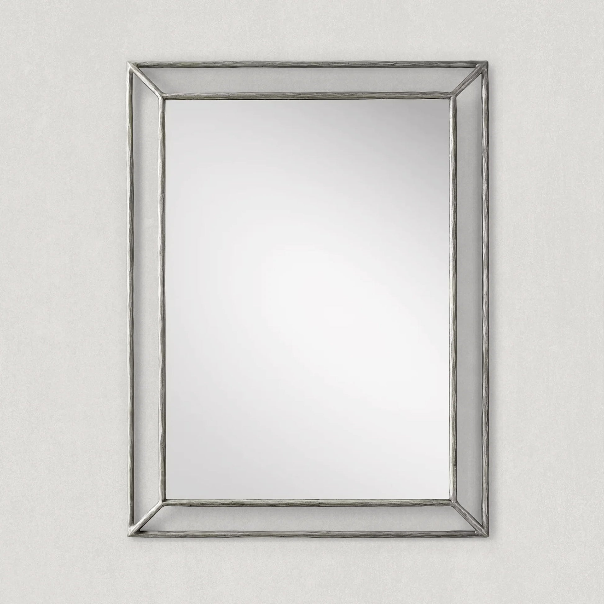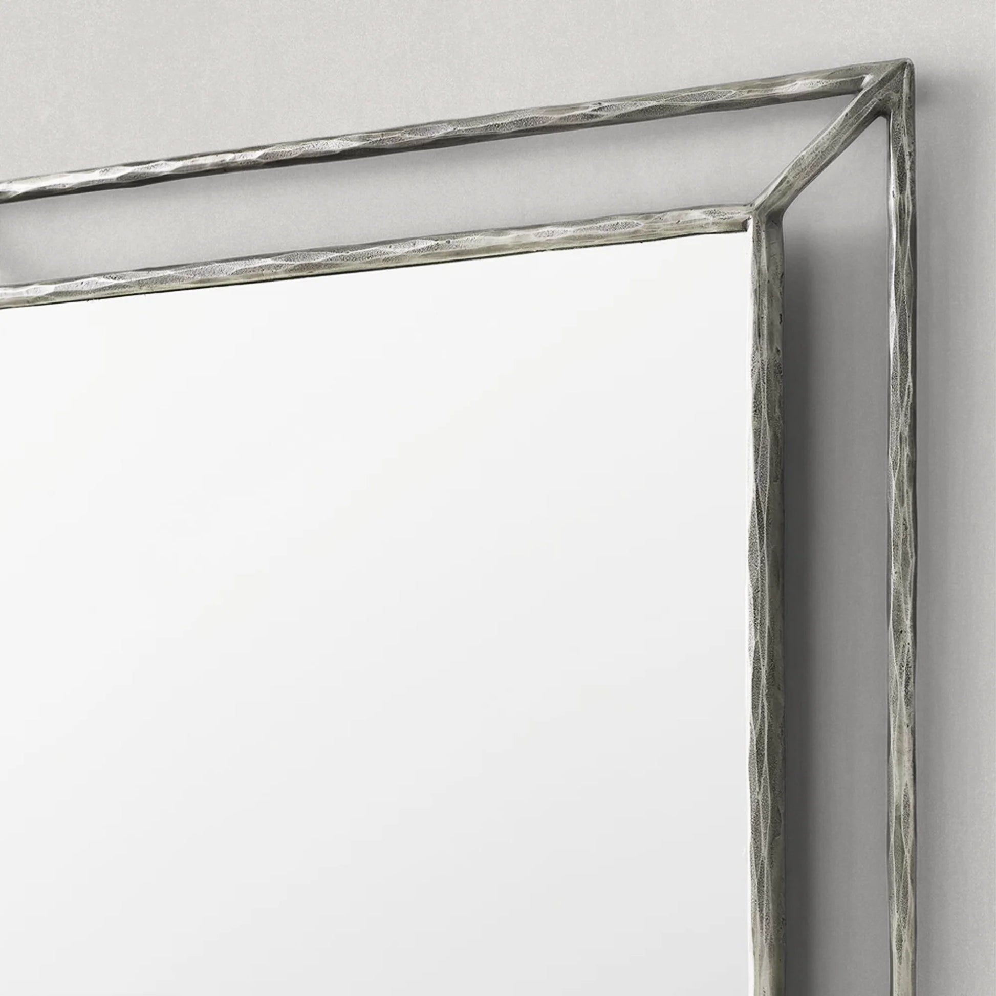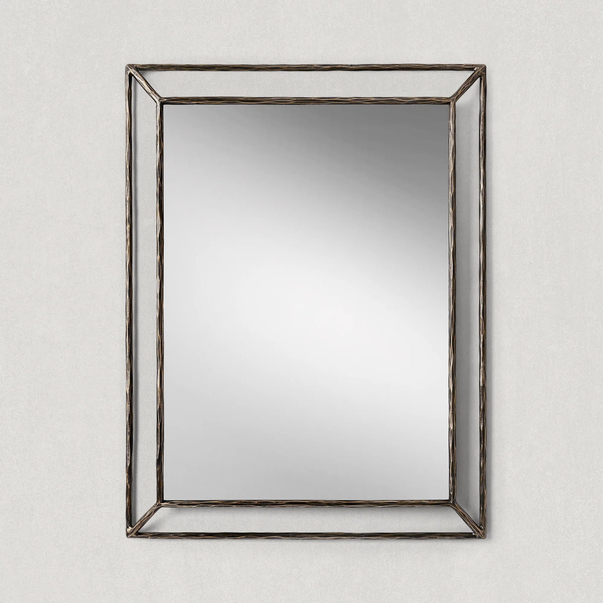 Our mirror from Julie Lawrence embodies the rustic sensibility of hand-forged metal. Employing an ancient fabrication process, artisans hand hammer the metal frame to reveal an alive, imperfect and organic texture. The angled open frame adds dimension to the slender silhouette.