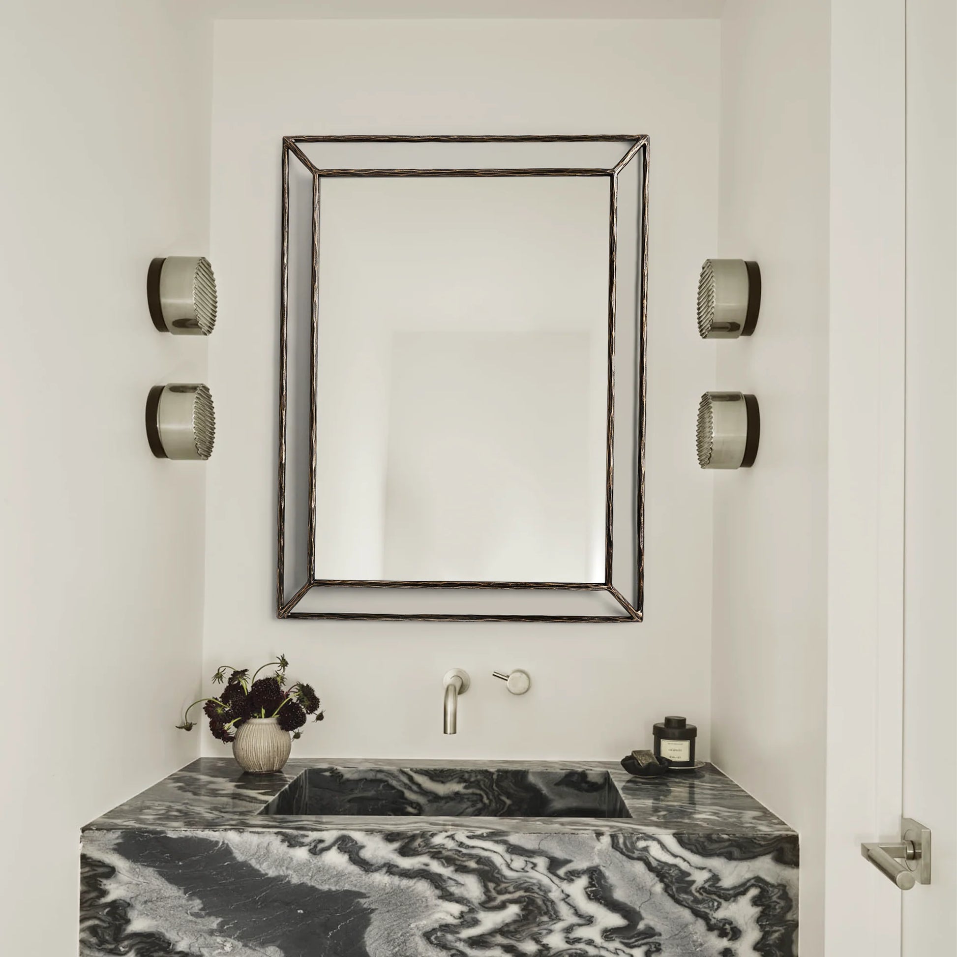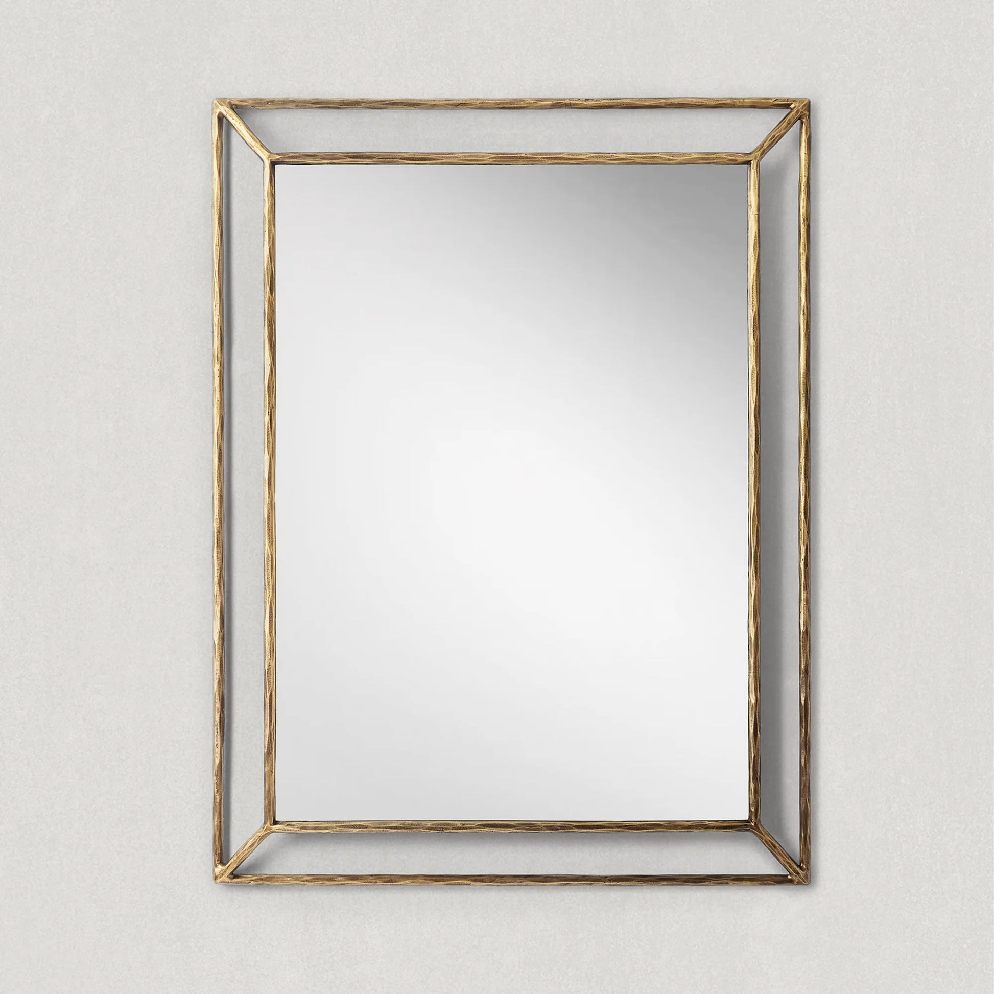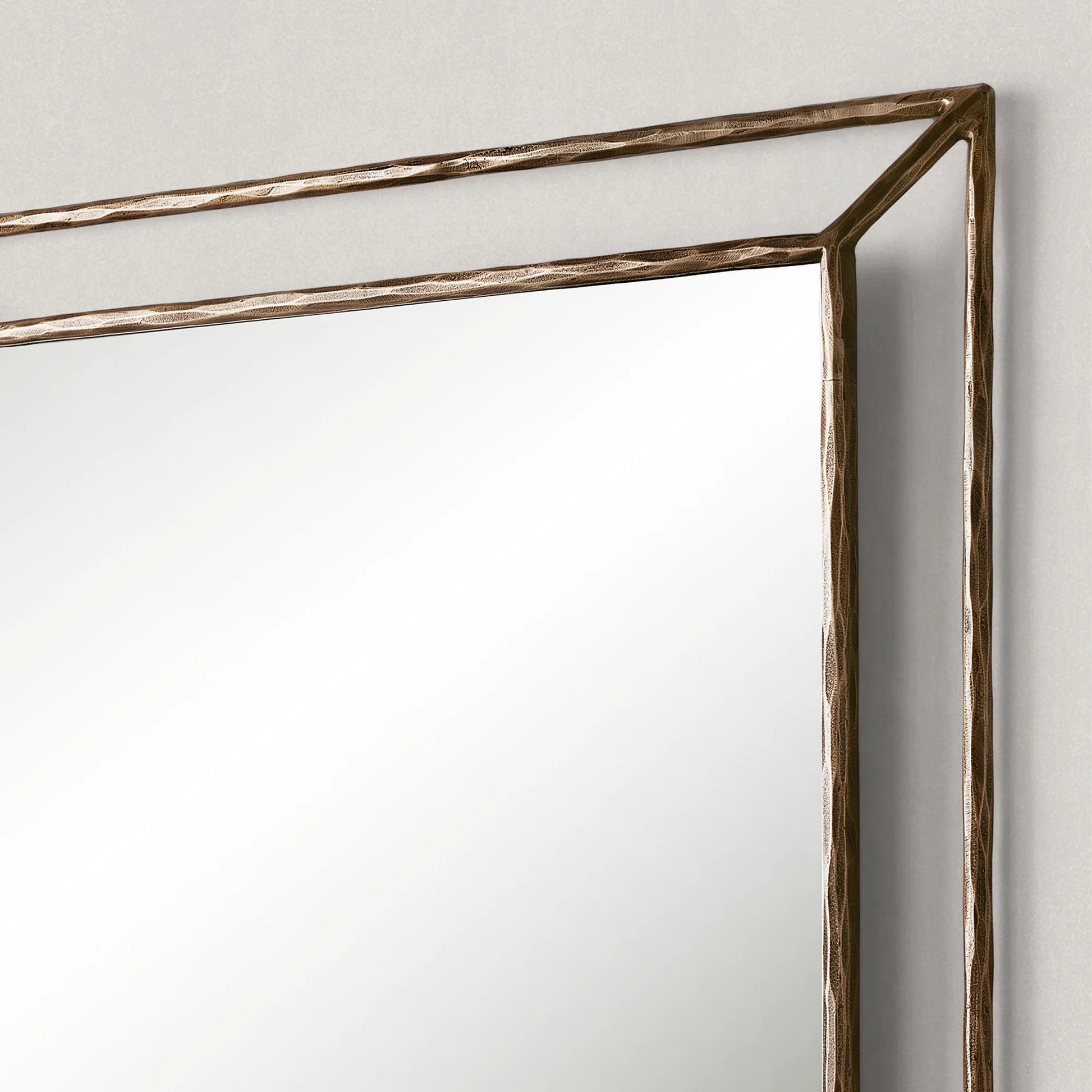 Our mirror from Julie Lawrence embodies the rustic sensibility of hand-forged metal. Employing an ancient fabrication process, artisans hand hammer the metal frame to reveal an alive, imperfect and organic texture. The angled open frame adds dimension to the slender silhouette.