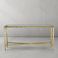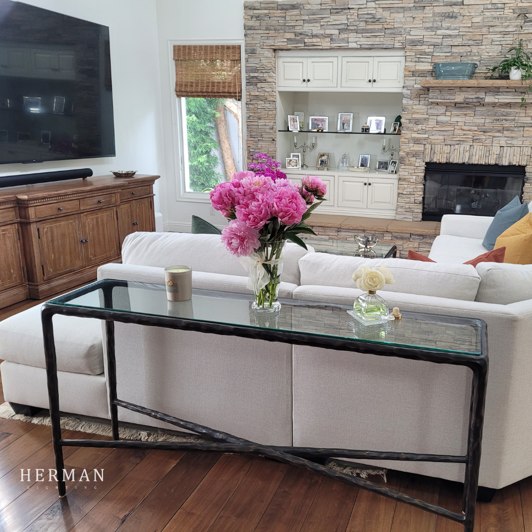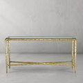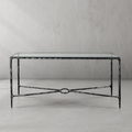 Our collection by the rustic sensibility of a hand-forged metal base with a clear glass top. Employing an ancient fabrication process, artisans hand hammer the metal bars to reveal an alive, imperfect and organic texture, a counterpoint to the frame's slender, tapered silhouette.