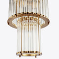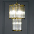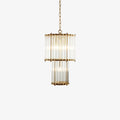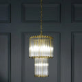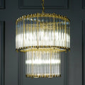 The stunning double Monza chandelier features an upper and lower tier of clear glass tubes in a drum formation. Each glass tube is individually placed to disperse a soft warmth and ambience to any room.
