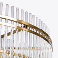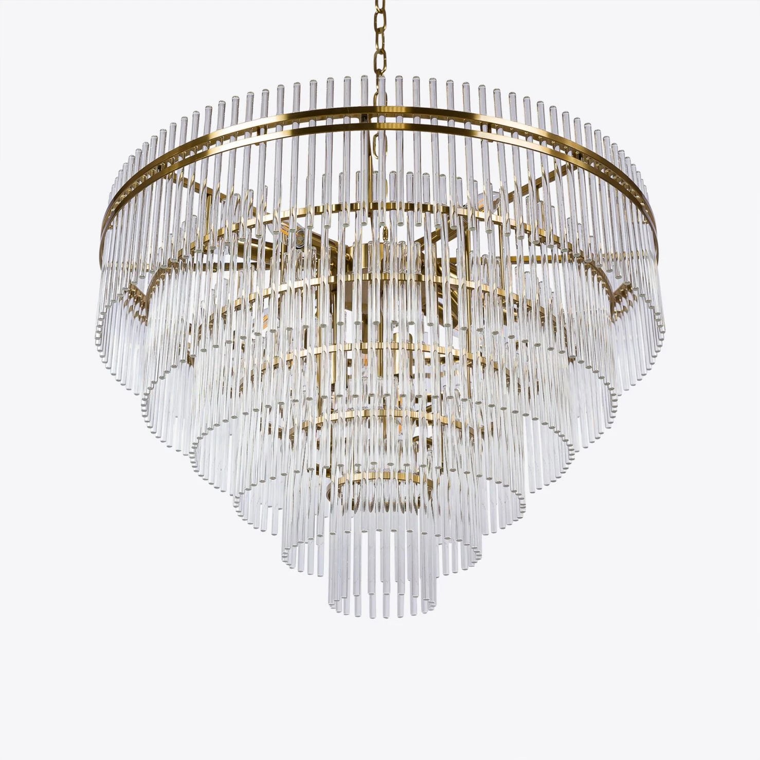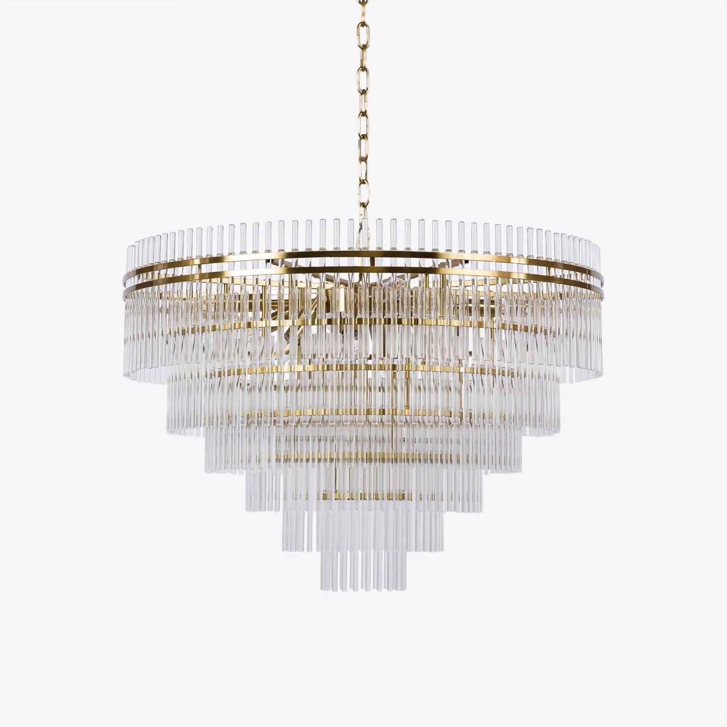 A beautiful Art Deco inspired chandelier formed of tiers of clear glass rods and sleek metalwork in a satin brass finish.