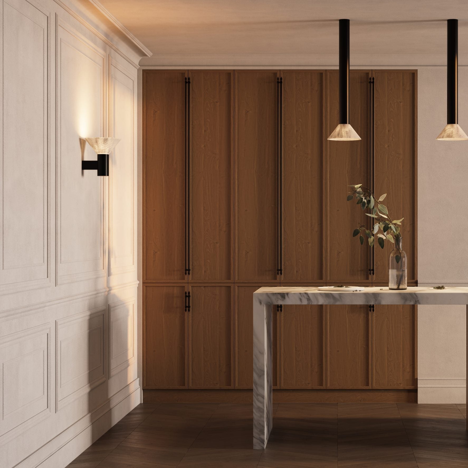 The perfectly proportioned conical shape of the TORRES wall light is reminiscent of ancient towers, where this shape symbolised strength and stability. With an IP44 rating, this wall-mounted light can extend its radiance to bathrooms and wetrooms. For a touch of refined embellishment, place the TORRES Wall on either side of a mirror, or harness the strong upwards illumination from its funnelled shade to light ceilings and corners. Choose from the alabaster shade for a more decorative finish that diffuses the light for a softer ambience or either polished nickel or bronze for a strong architectural statement.