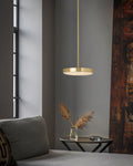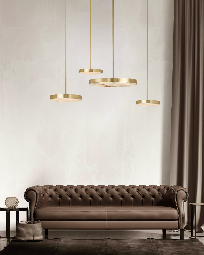 - Hand-honed natural alabaster disc framed in satin brass for organic-modern elegance.