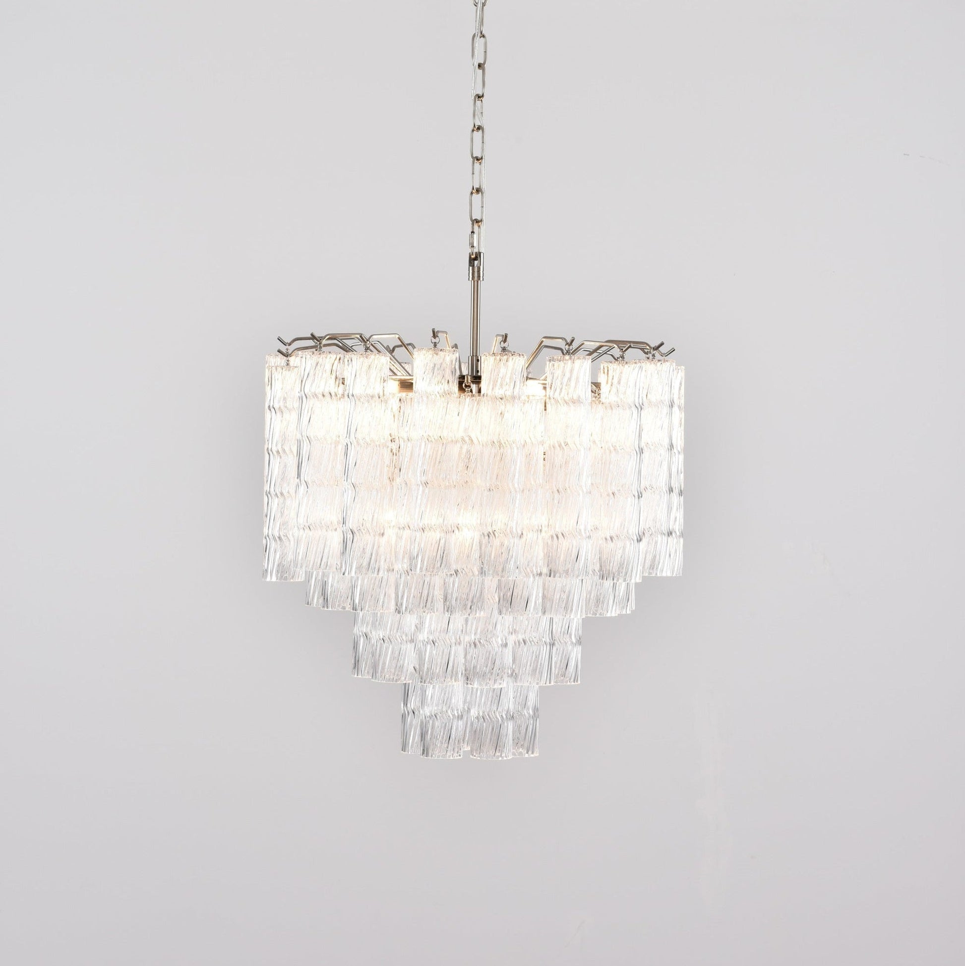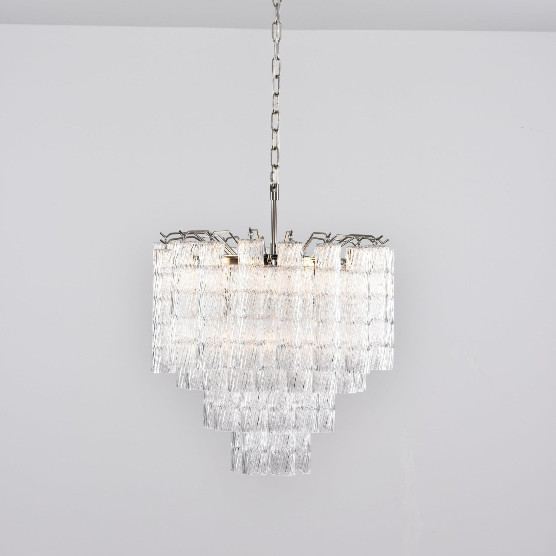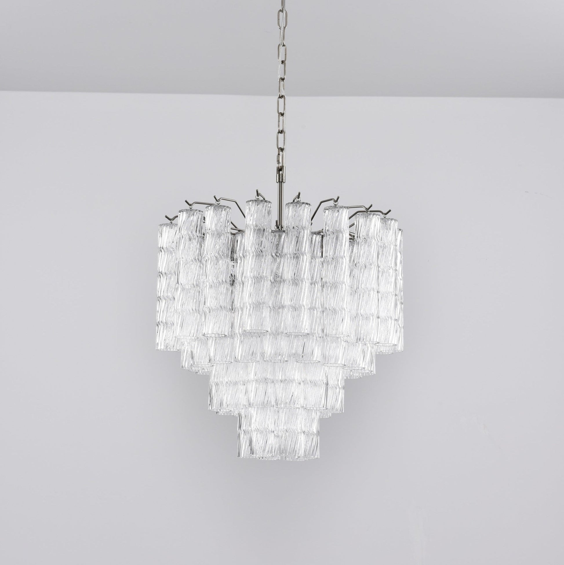 A stunning display of Murano glass mastery, the Vetrina Chandelier features tiered textures that resemble cascading waves of light. Each hand-molded glass block carries subtle ripples, creating a brilliant optical effect as light reflects and refracts across its surface.